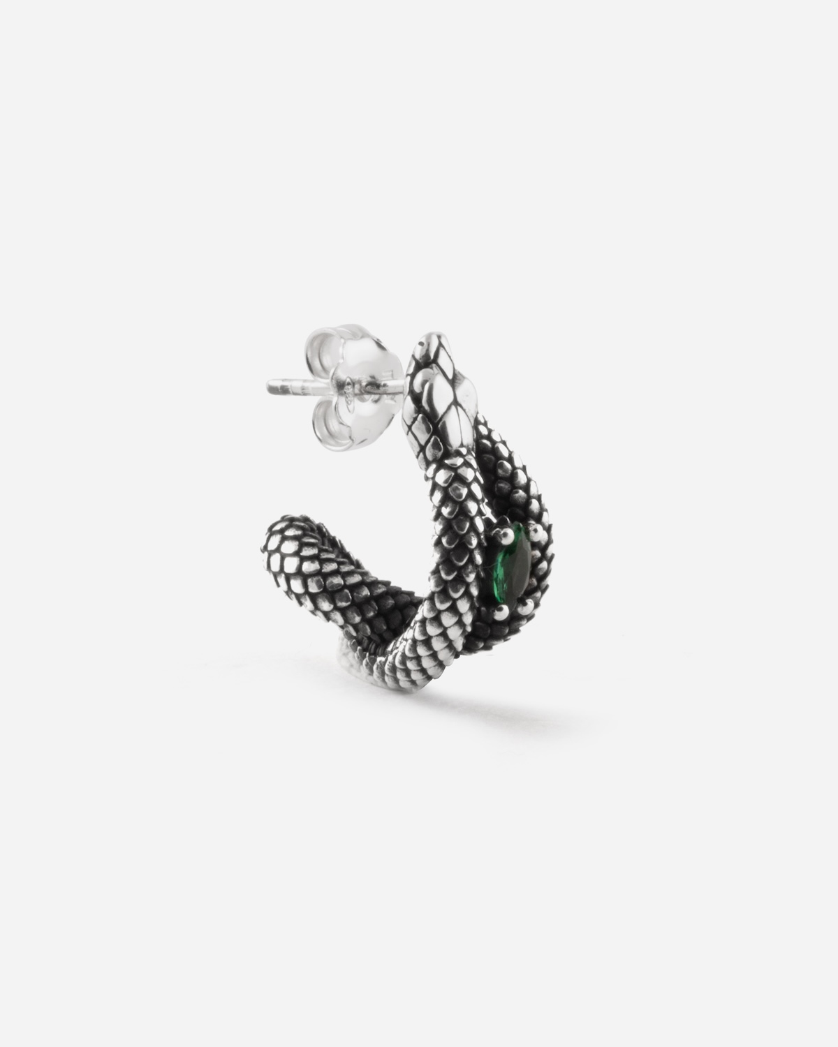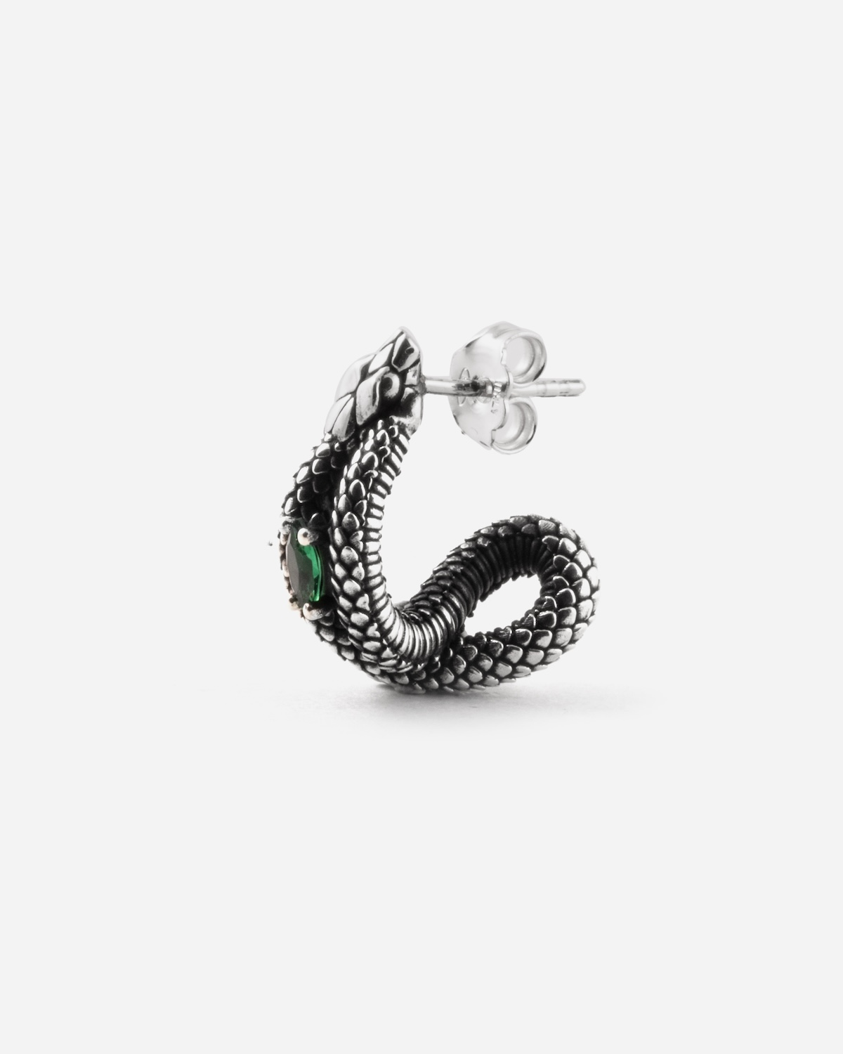 The Poisoned Snake Hoop Earring With Green Stone is part of the Snake Collection and is made in 925 Sterling Silver. Every Nove25 jewel is designed and produced in Italy using the most modern technologies then hand finished to ensure maximum detail and the highest quality. This jewel finish is Polished Burnished and it is available in one single size.