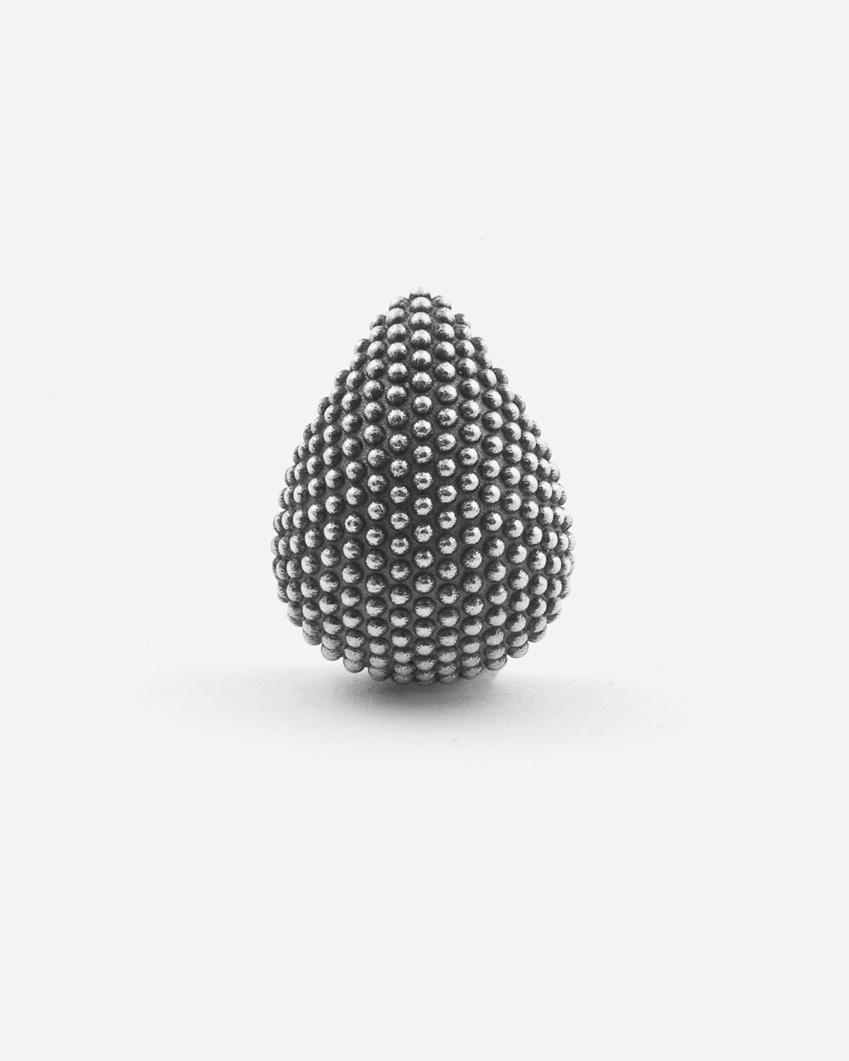 Bathed in dew and illuminated by the rays of dawn, the Thousand Drops earring is a large drop in polished burnished sterling silver with a dotted surface.