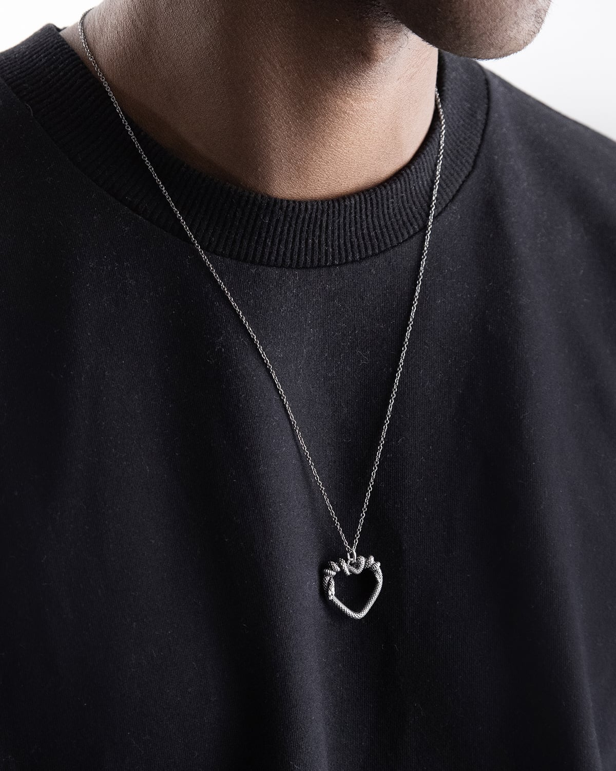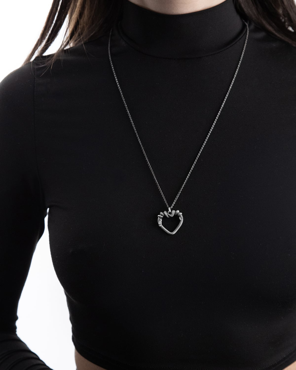 Die Schlange des vergifteten Herzanhängers formt mit ihren Windungen ein geschupptes Herz aus poliertem, brüniertem Silber, das von den süßesten und beunruhigendsten Gefühlen verdorben ist.