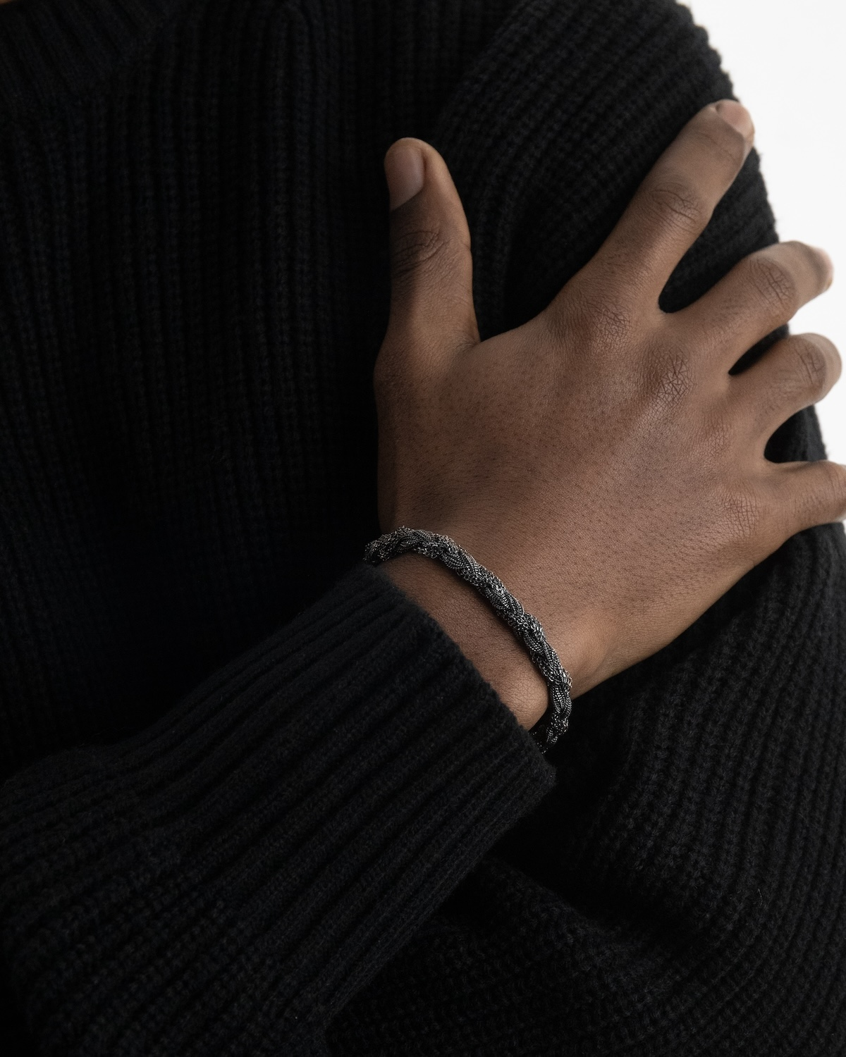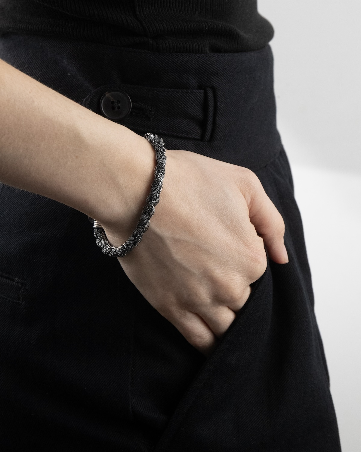 Wie die Schnur eines alten Festnetztelefons verknotet, verleiht das ARMBAND MIT DOPPELTER MASCHE in der polierten, brünierten Version einen pikanten Touch, wie die Indiskretionen, die in den Telefonhörer geflüstert werden.