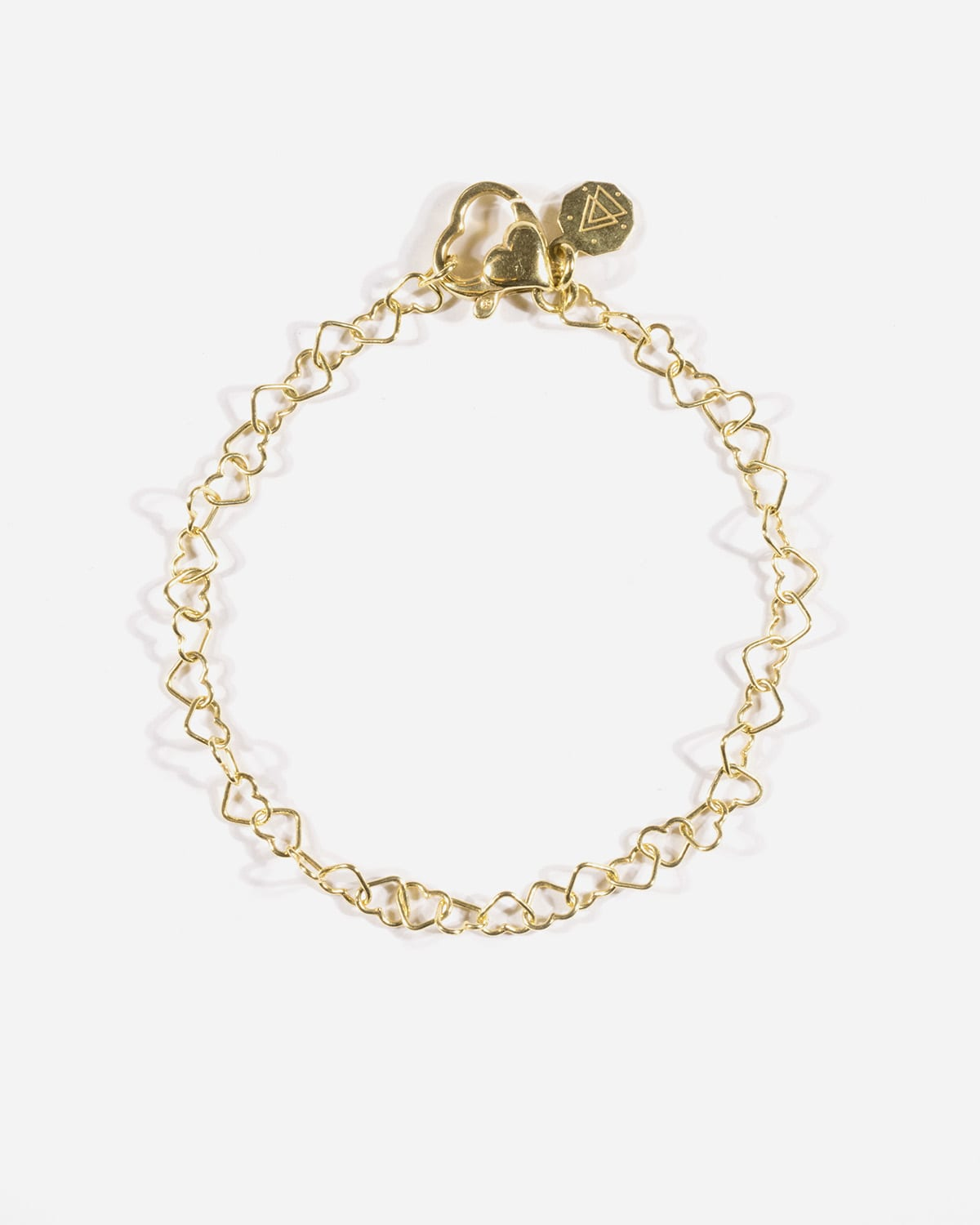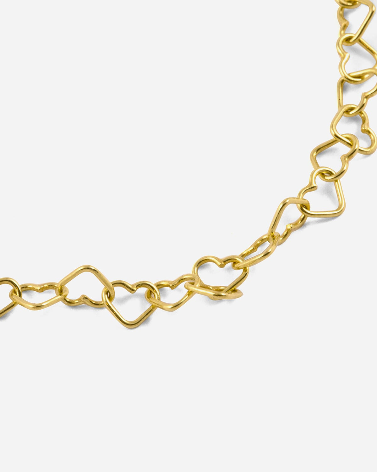 Das Armband Meterware Love aus poliertem Gelbgold zeigt kleine, dünne, ineinander verschlungene Herzen, einen leuchtenden Pfad, der zum Herzanhänger führt, und zum Symbol Nove25.
