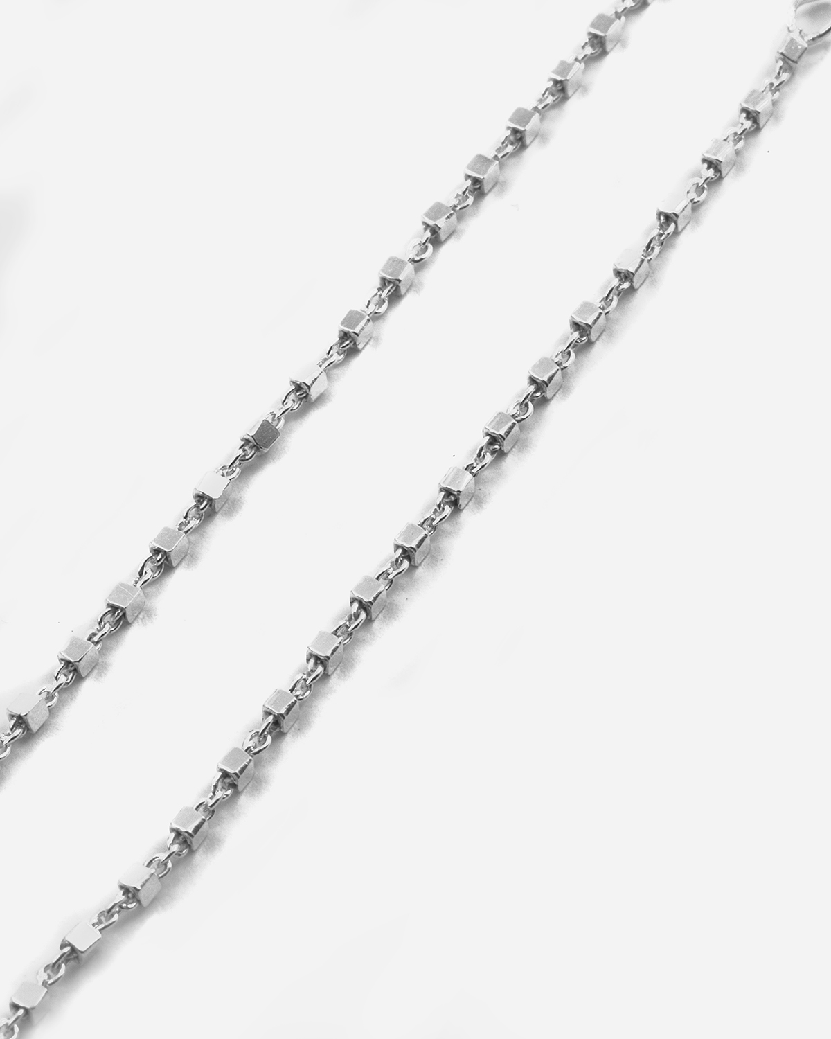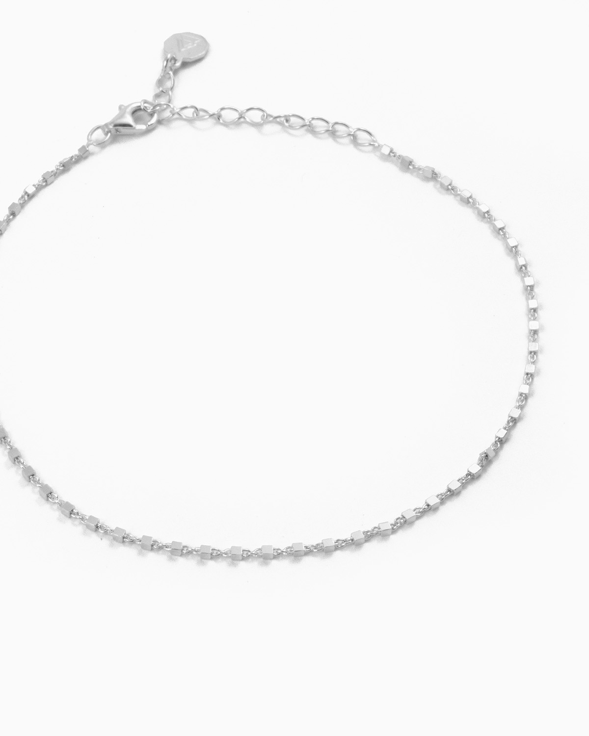 Das Kettenglied des Fußkettchens Silver Dice verbindet viele kleine silberne Würfel in einem geometrischen Spiel aus Reflexionen.