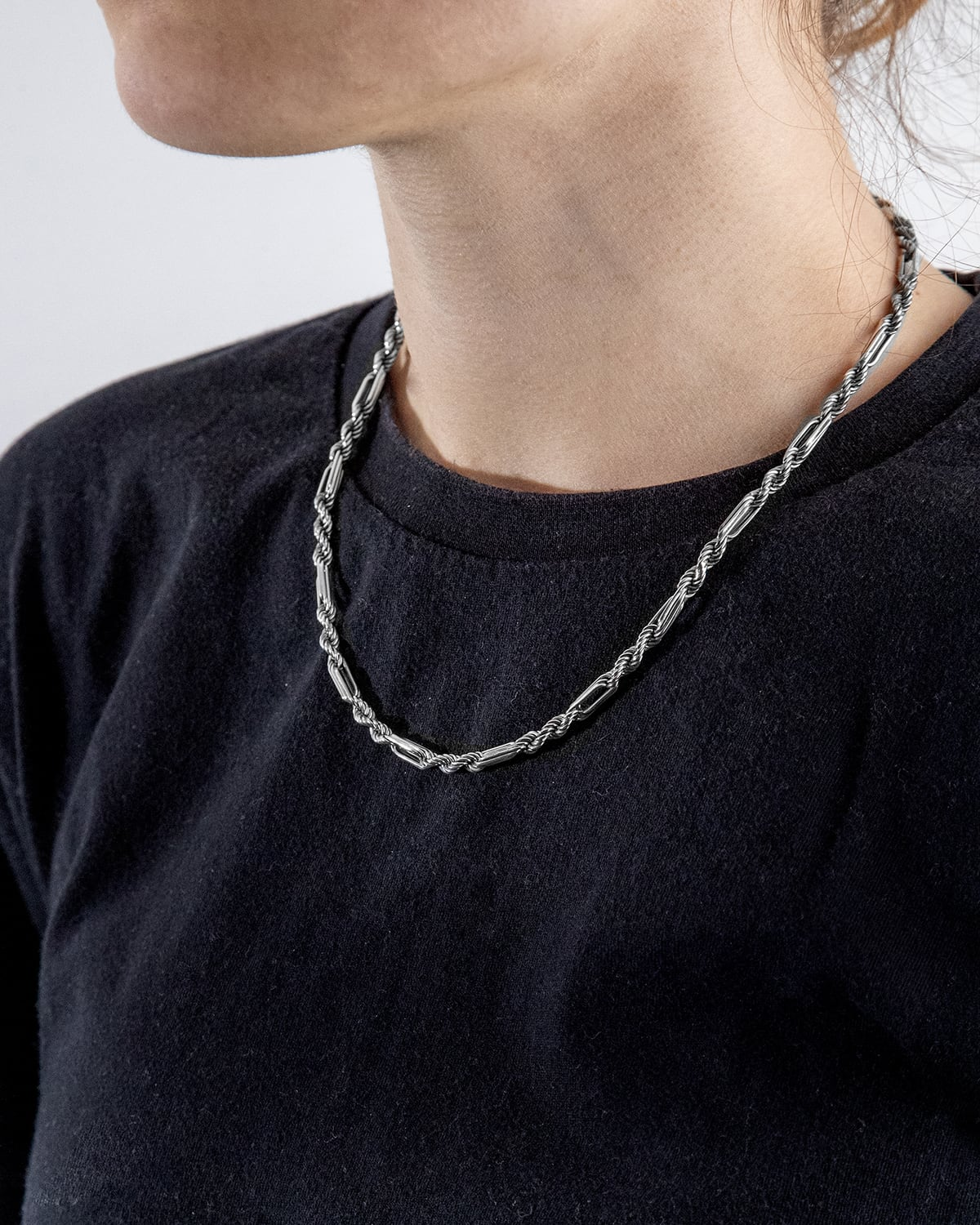 Das Halsband SEIL 080 ABWECHSELND ist von dem gleichnamigen Armband inspiriert und besteht aus abwechselnden geraden Linien, die sich um sich selbst wickeln, als wären sie vom Wasser geformt.