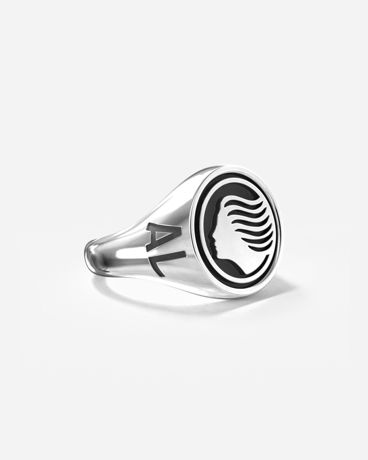 Der runde Chevalier mit Logo ist mit dem Flachrelief der Dea verziert, einem historischen und anschaulichen Symbol der Atalanta, das durch die brünierte Silberoberfläche hervorgehoben wird. Er kann mit Zahlen und Initialen graviert werden und ist der perfekte Ring, um dem Jubel neues Leben einzuhauchen, in einer neuen, glänzenden und eleganten Form.