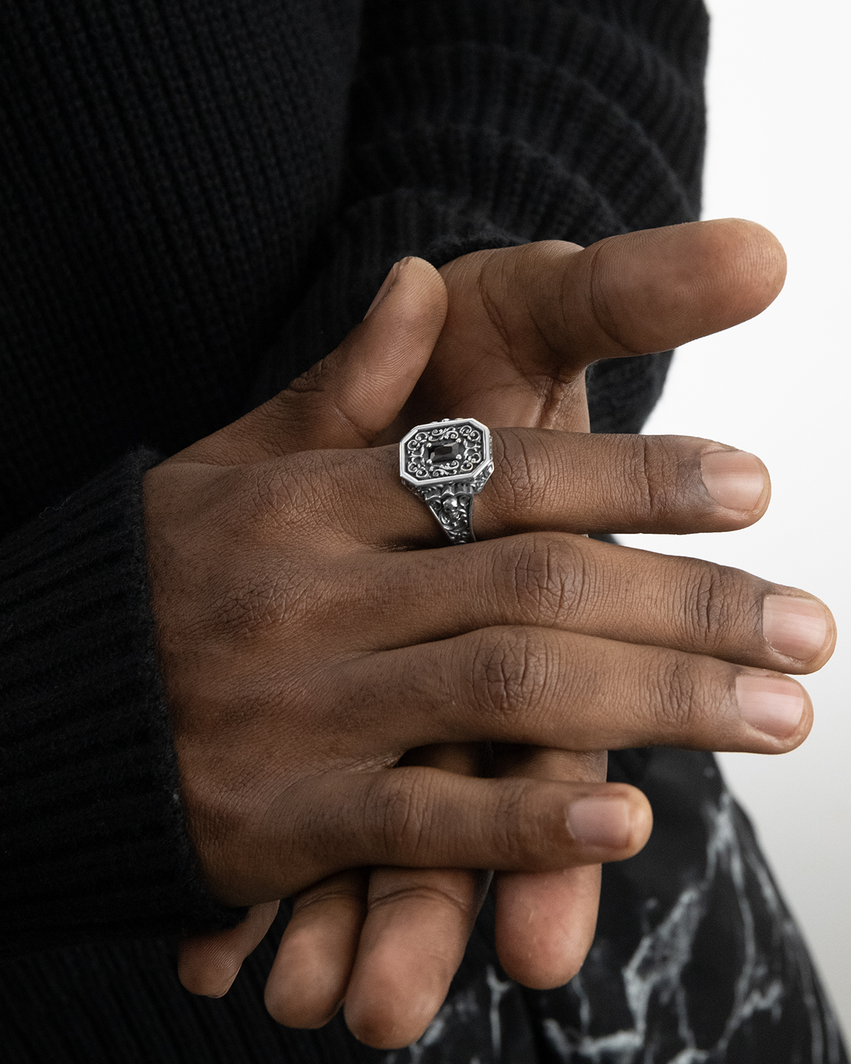 SIEGELRING OKTAGON DEKORIERT CLYDE MIT SCHWARZEN STEIN