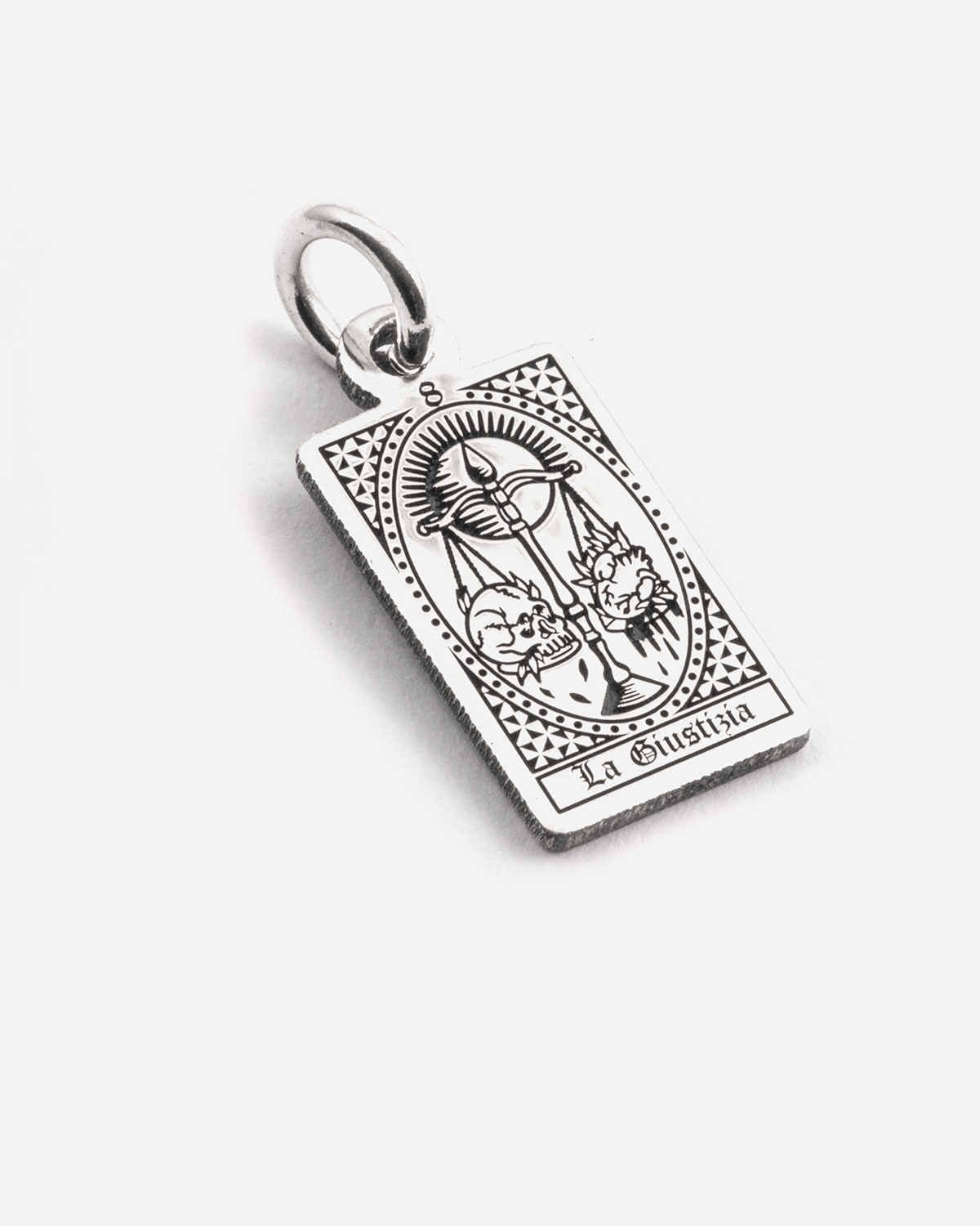 The Justice Tarot Card Pendant is part of the Tarocchi Collection and is made in 925 Sterling Silver. Every Nove25 jewel is designed and produced in Italy using the most modern technologies then hand finished to ensure maximum detail and the highest quality. This jewel finish is Polished Burnished or Yellow Gold and it is available in the following sizes: 20-28 mm.