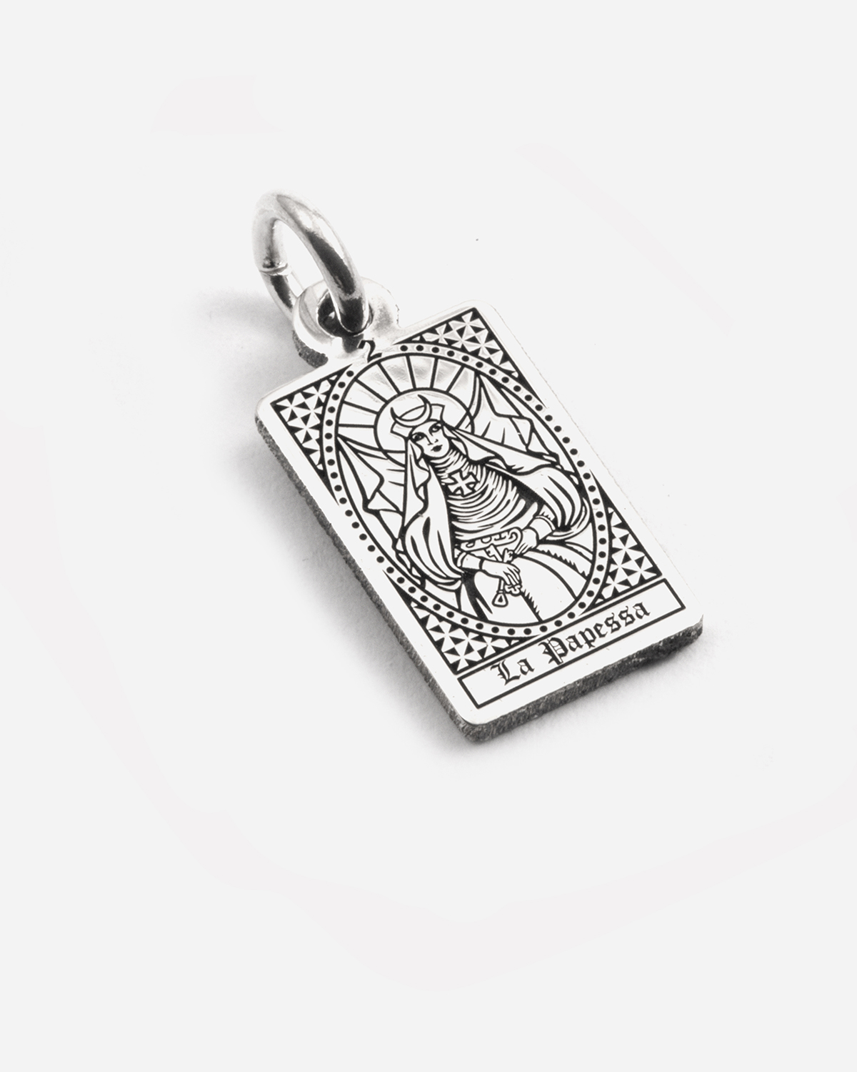 The High Priestess Tarot Card Pendant is part of the Tarocchi Collection and is made in 925 Sterling Silver. Every Nove25 jewel is designed and produced in Italy using the most modern technologies then hand finished to ensure maximum detail and the highest quality. This jewel finish is Polished Burnished or Yellow Gold and it is available in the following sizes: 20-28 mm.