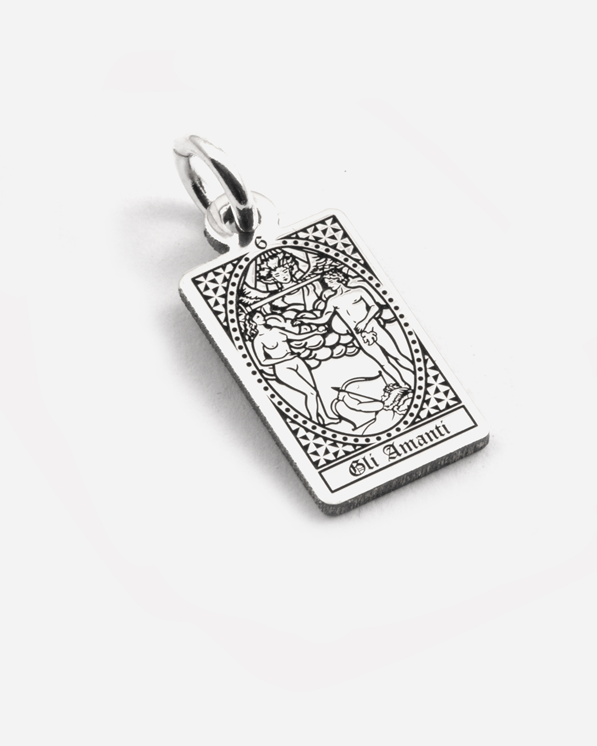 The Lovers Tarot Card Pendant is part of the Tarocchi Collection and is made in 925 Sterling Silver. Every Nove25 jewel is designed and produced in Italy using the most modern technologies then hand finished to ensure maximum detail and the highest quality. This jewel finish is Polished Burnished or Yellow Gold and it is available in the following sizes: 20-28 mm.