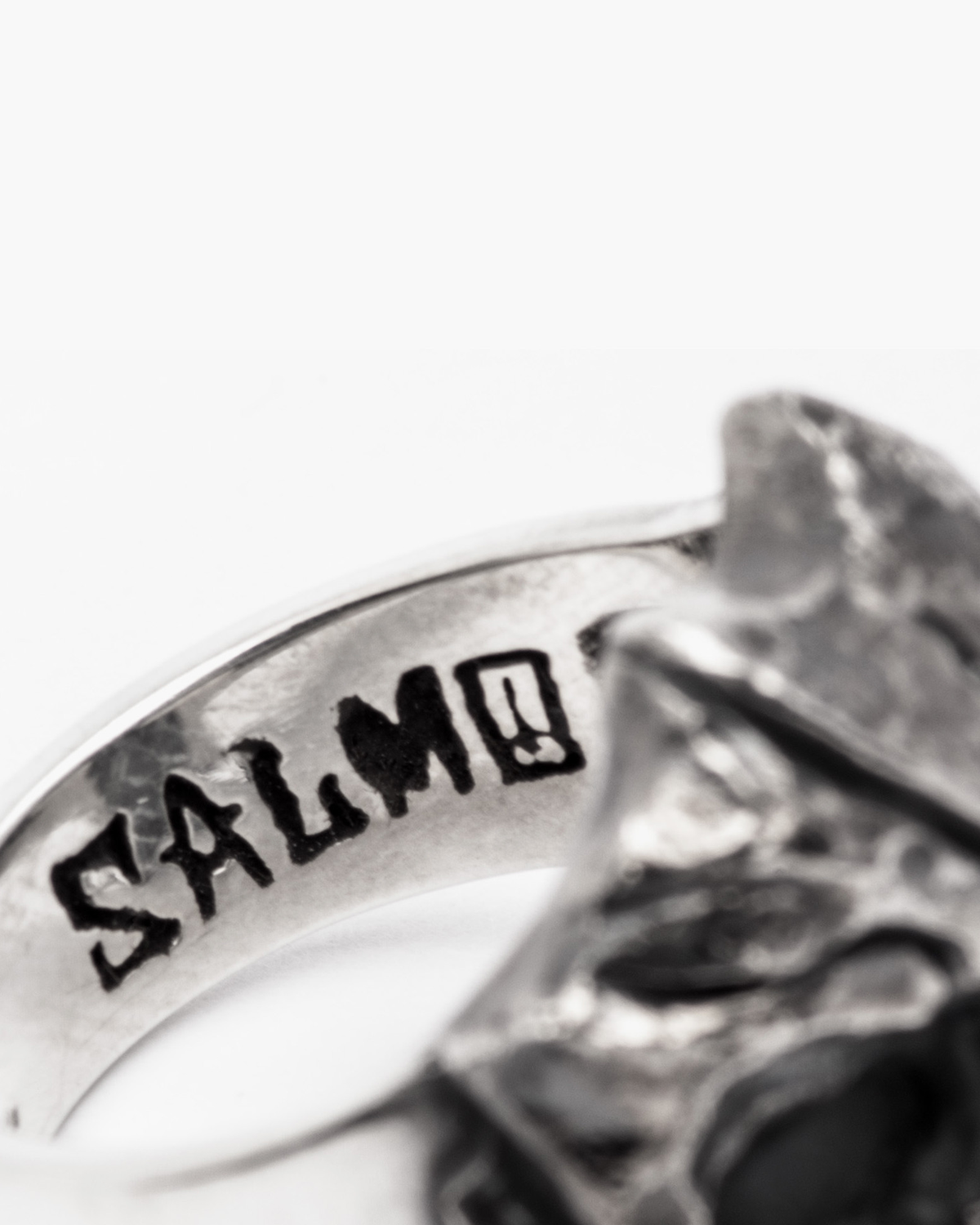 The Sterling Silver Salmo Skull Ring has been entirely hand-finished by a team of highly skilled silversmiths in Nove25 milanese workshop. This piece is the result of a collaboration between Nove25 and the artist Salmo after he went Platinum with his famous Hellvisback album.