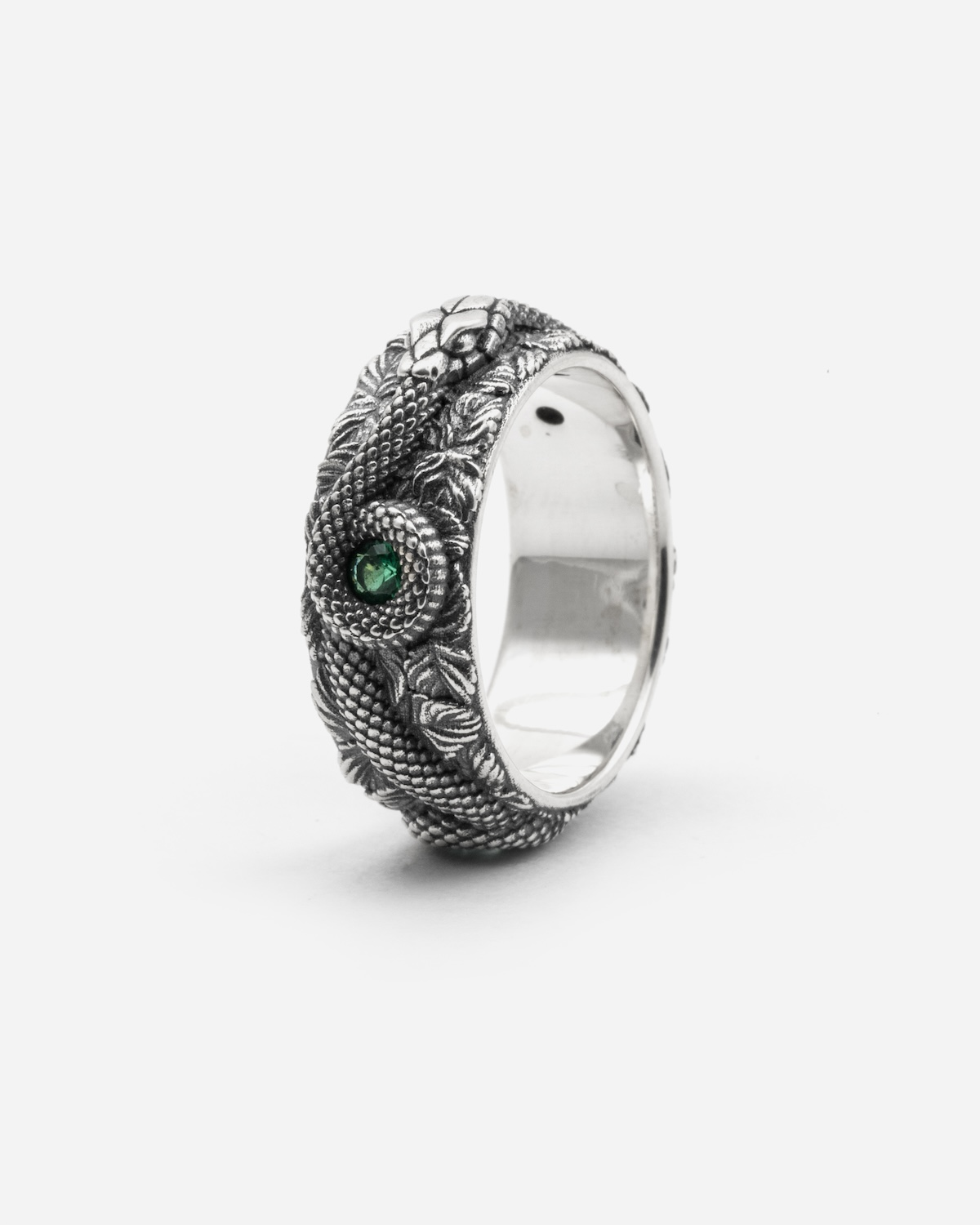 ANILLO BANDA SERPIENTE DE PLATA CON BRILLANTES VERDES