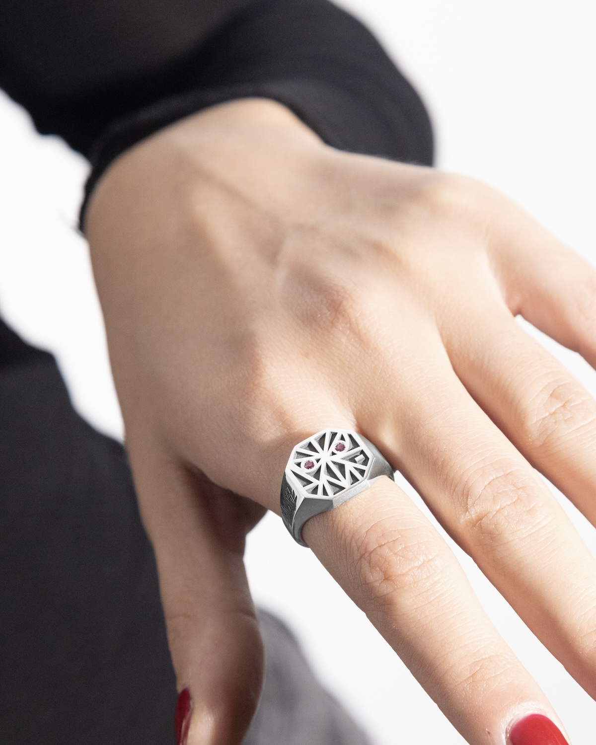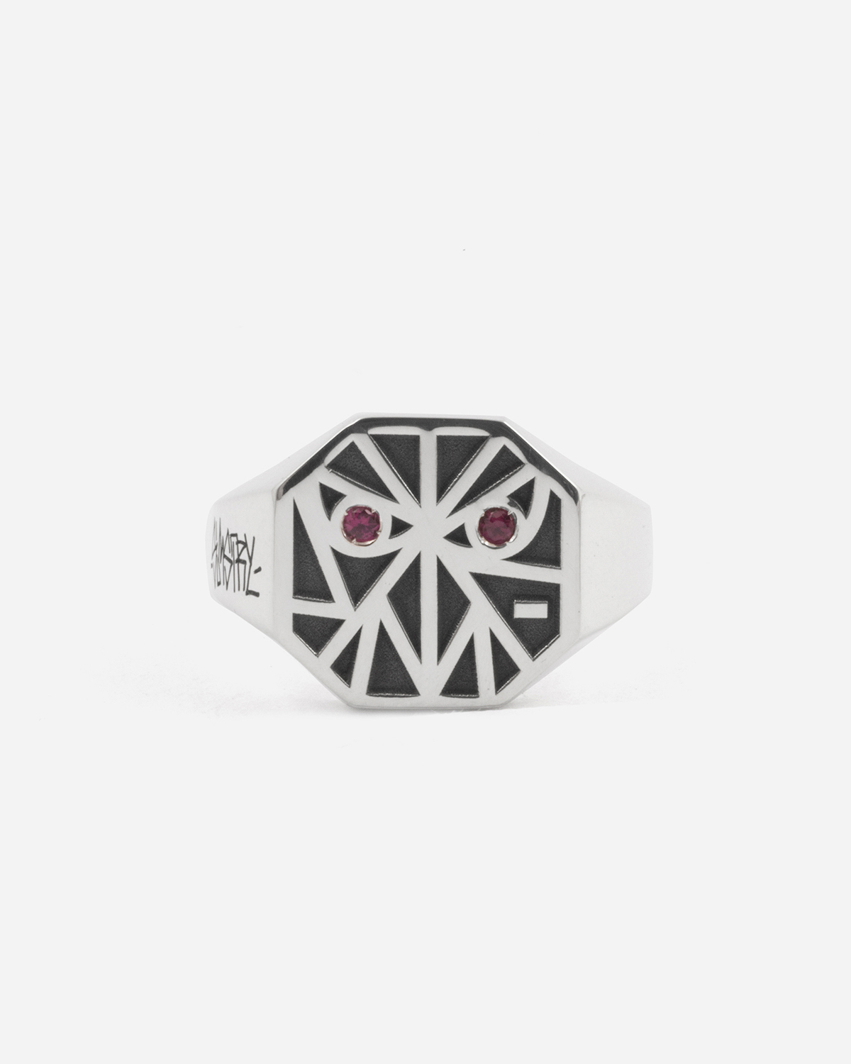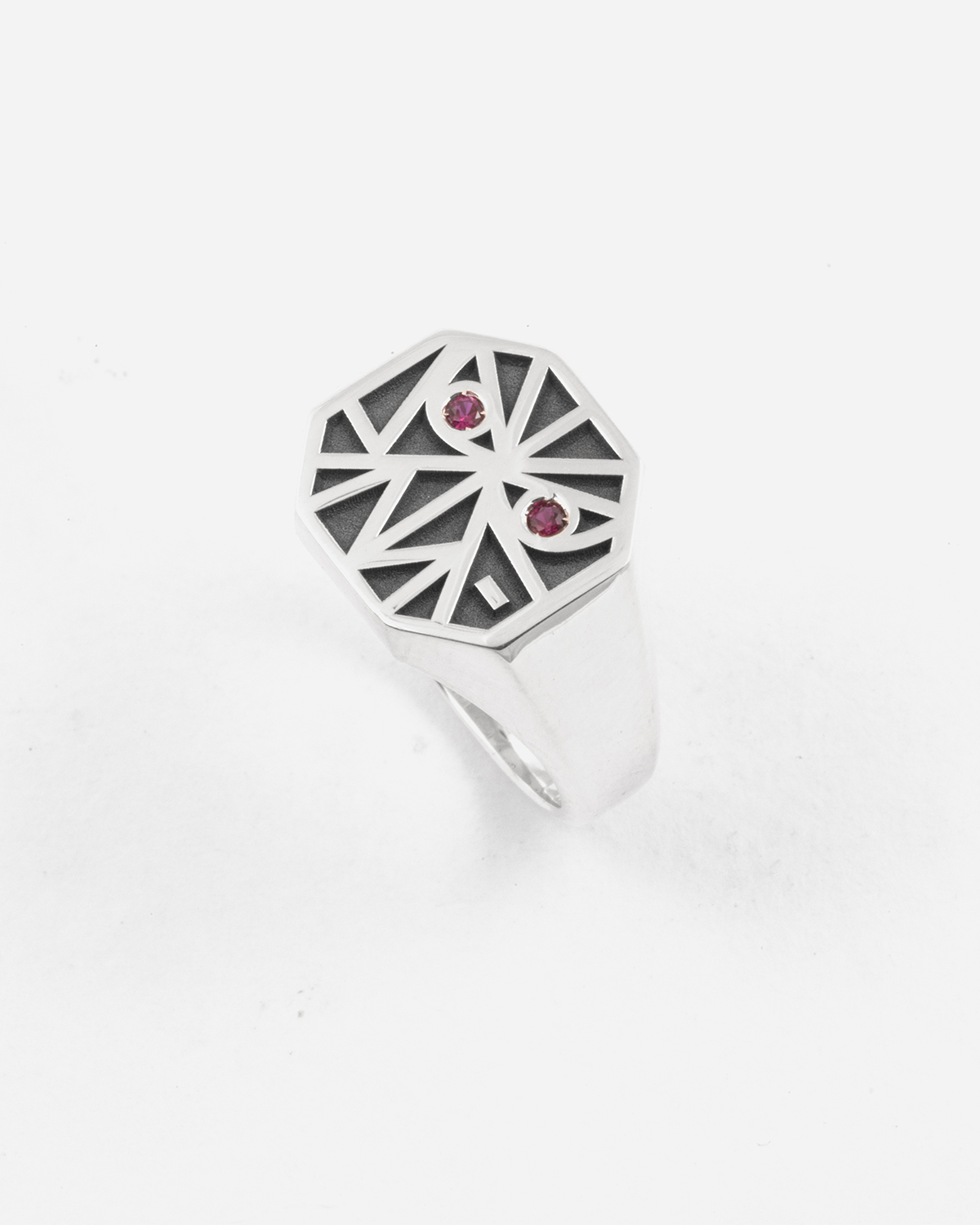 Los ojos, elemento distintivo de la obra de Solomostry, están en el corazón de este chevalier octogonal, otra forma clásica de Nove25. Entrelazadas, las líneas en bajorrelieve sobre una base de plata bruñida describen formas y geometrías que recuerdan un rostro, en el que se reconoce la mirada que da nombre a la joya. Para personalizar y hacer aún más único e íntimo el anillo Ojos, también es posible adornarlo con dos piedras de color, que se convierten en dos pupilas capaces de evocar recuerdos e iluminar el futuro.