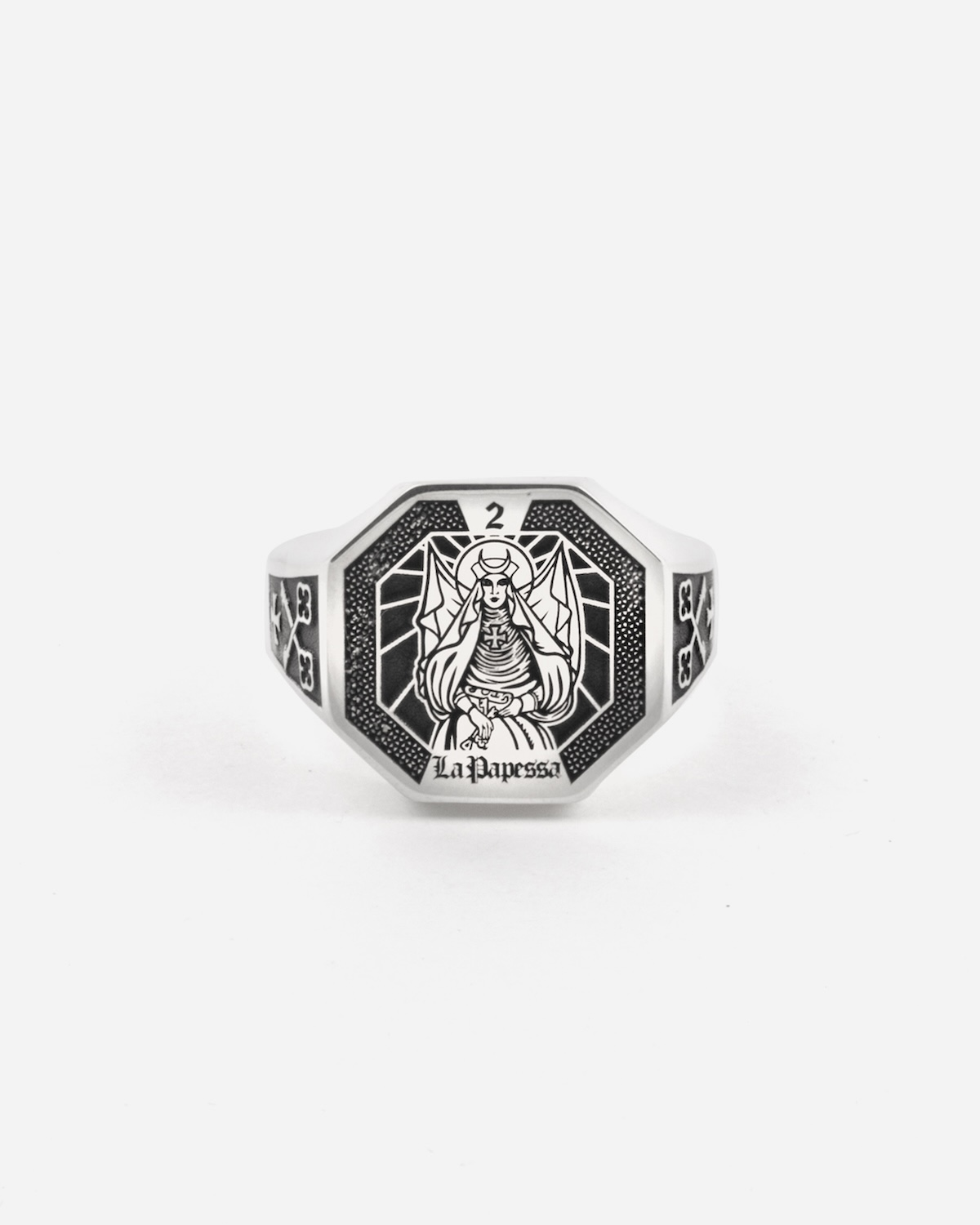 El Chevalier Carta De Tarot La Sacerdotista forma parte de la Colección Tarocchi y está fabricado en plata de ley 925. Como todas las joyas Nove25 también este Anillo se diseña y fabrica íntegramente en Italia con las tecnologías más modernas y se termina a mano para garantizar el máximo cuidado en los detalles y la más alta calidad. Esta joya se presenta en un acabado Bruñido Brillante y está disponible en las siguientes tallas: de 3 a 28.