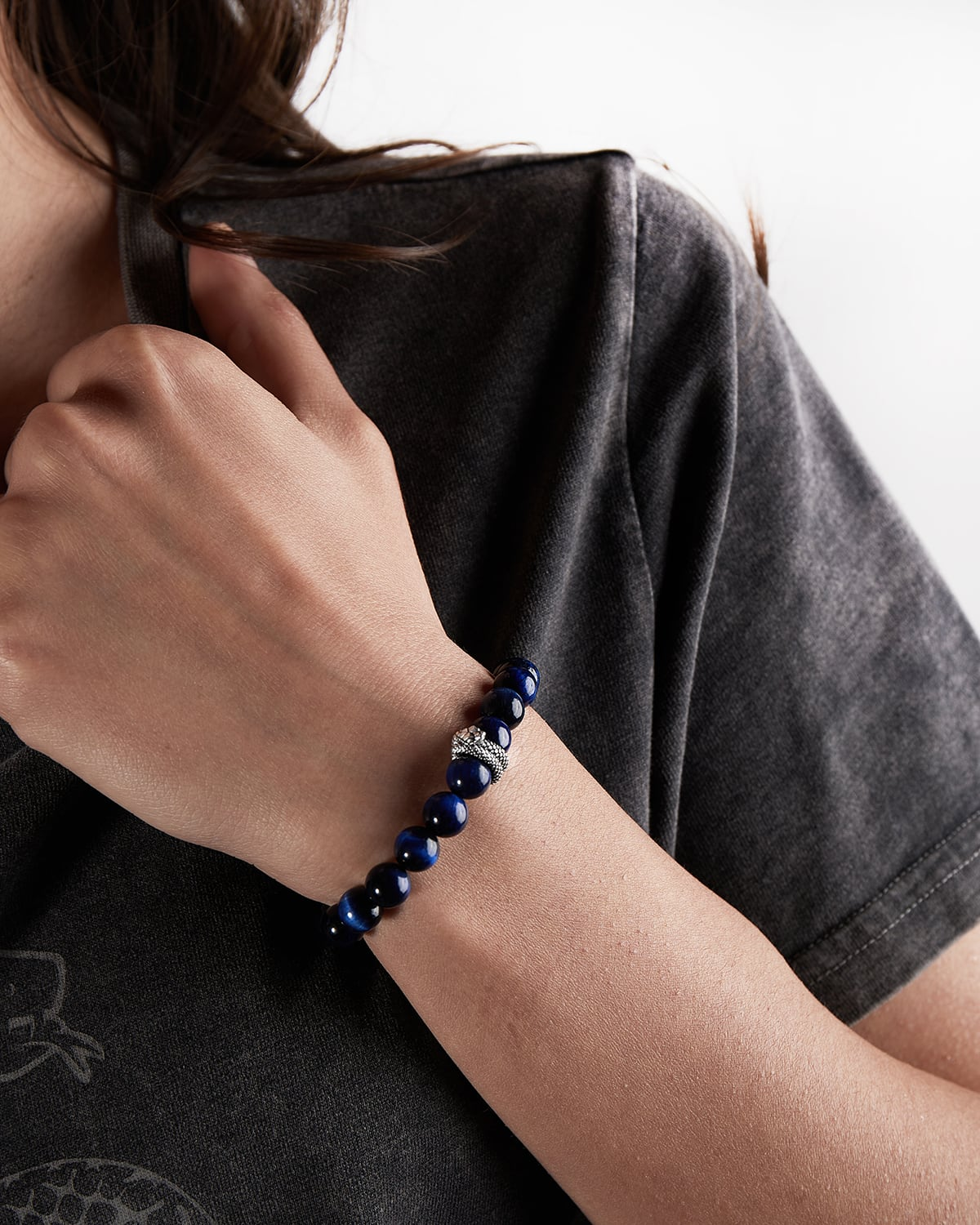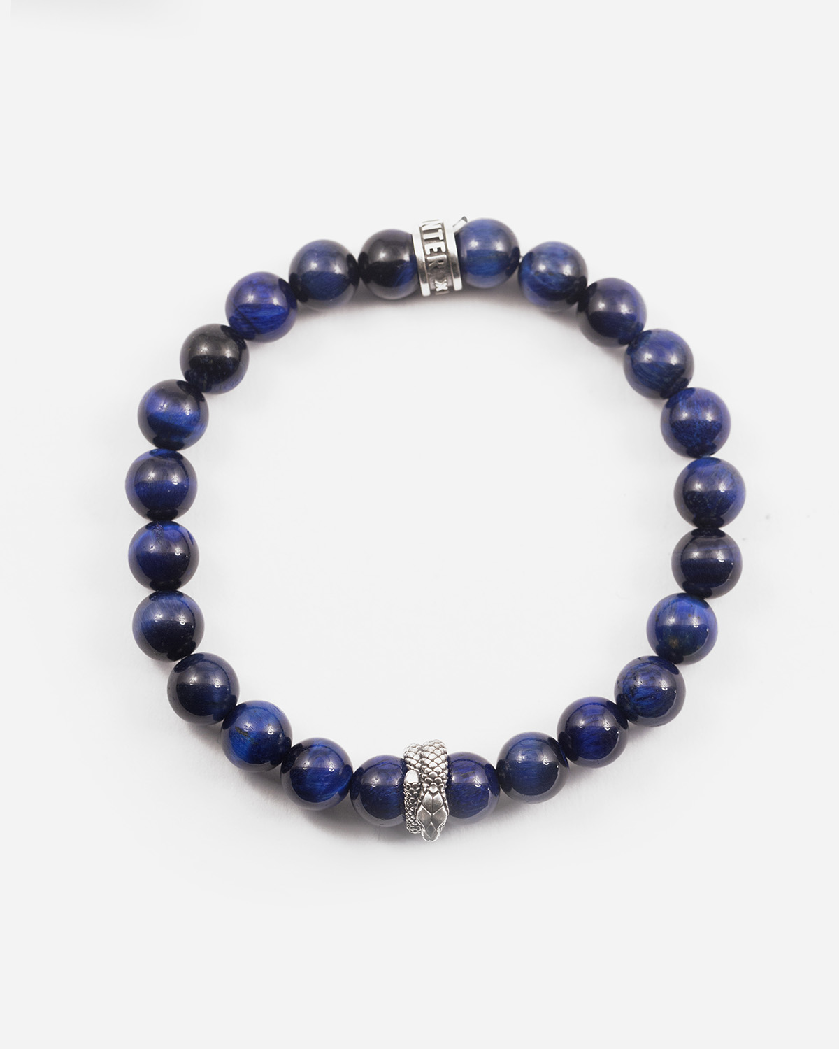 La colección INTER X NOVE25 añade a sus joyas exclusivas una nueva pulsera en piedras ojo de halcón, que cambian de color de negro a azul bajo el sol, recordando los colores del club. También está adornada con dos adornos de plata: el símbolo de la serpiente del equipo y un pequeño anillo con las palabras INTER X NOVE25 en bajorrelieve sobre plata bruñida.