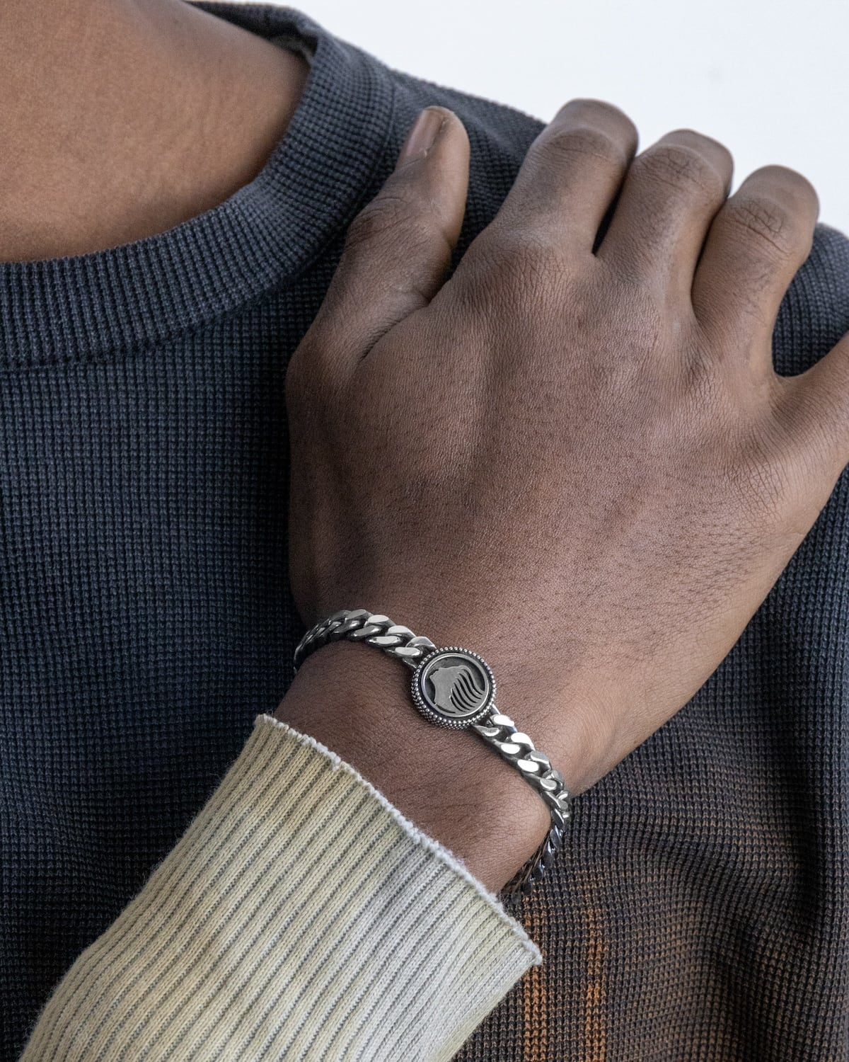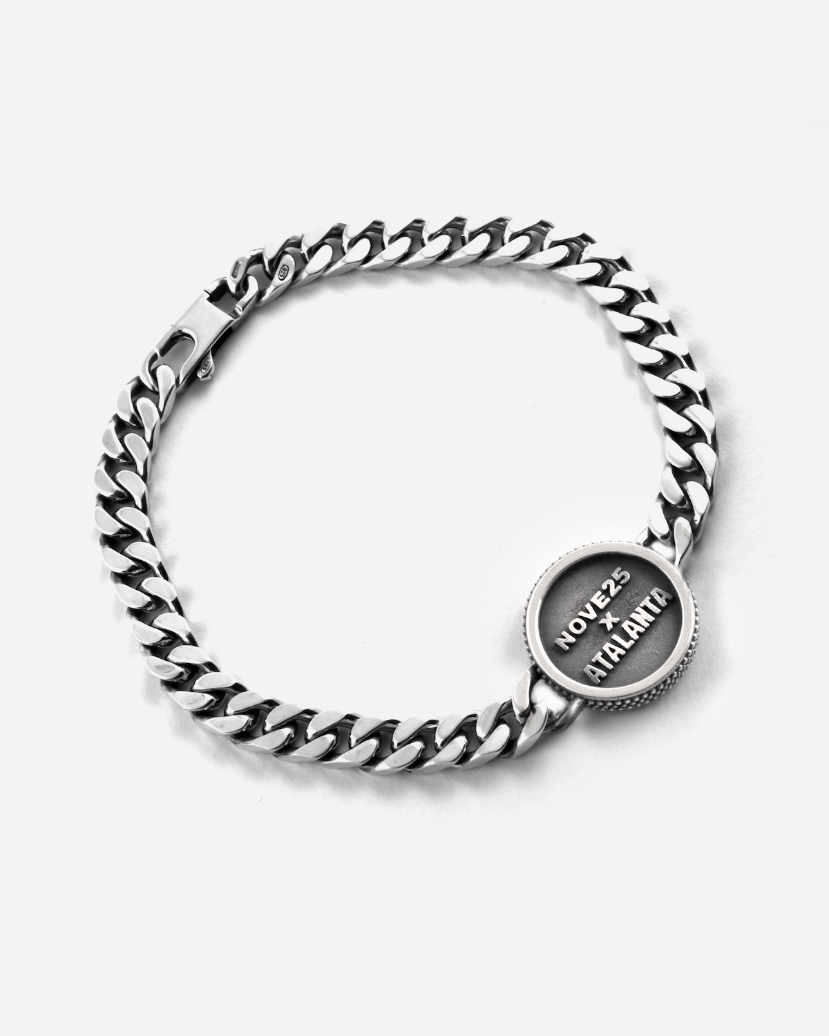 Brillante e impactante, la Pulsera Grumette Logo, con metrajé de plata y cierre de langosta, abraza el símbolo en bajorrelieve de la Dea, rodeado por un doble círculo punteado. En el reverso del emblema, Nove25 y Atalanta reconfirman su colaboración, sintetizándola en una joya perfecta para quienes animan desde las gradas y en la vida cotidiana.