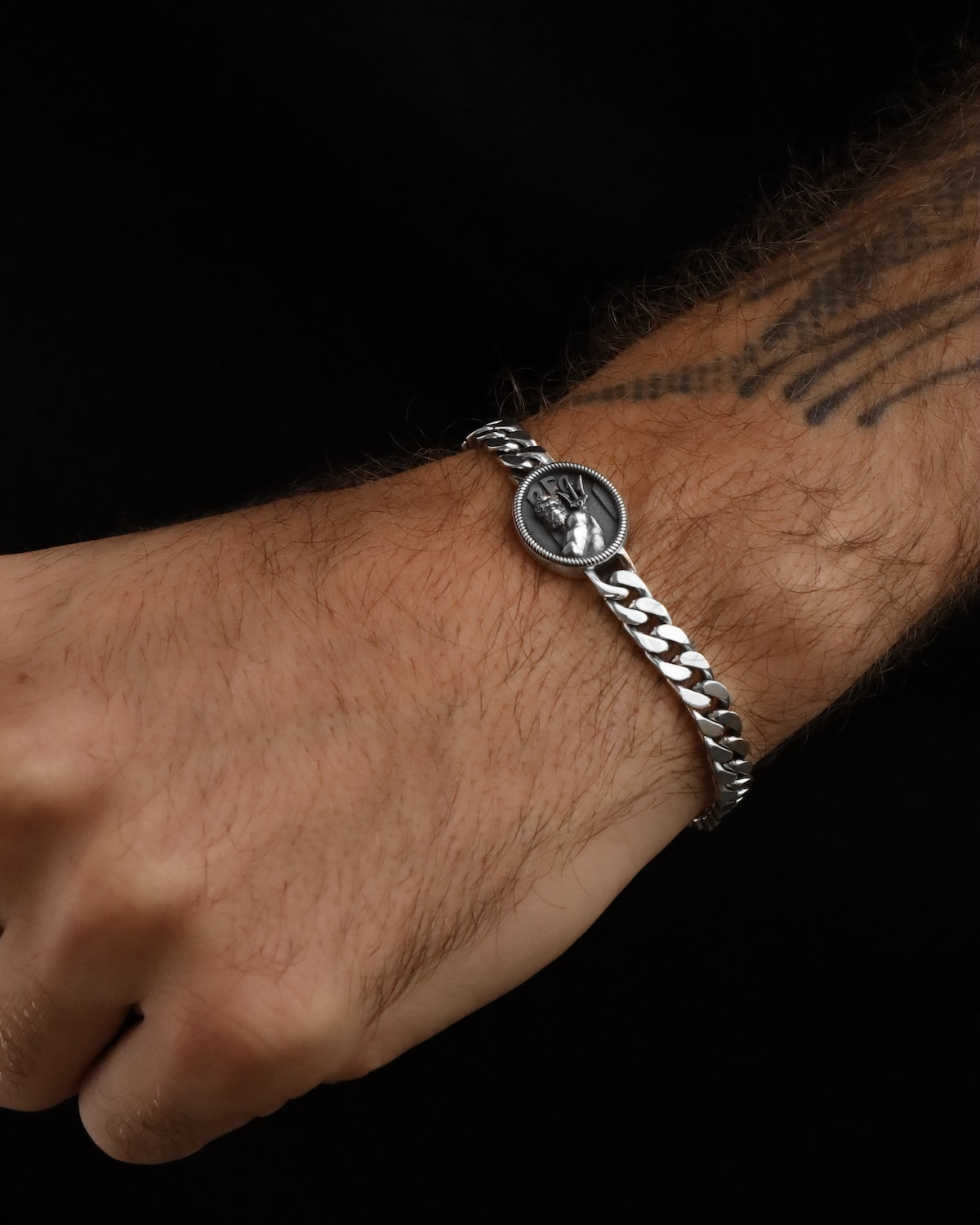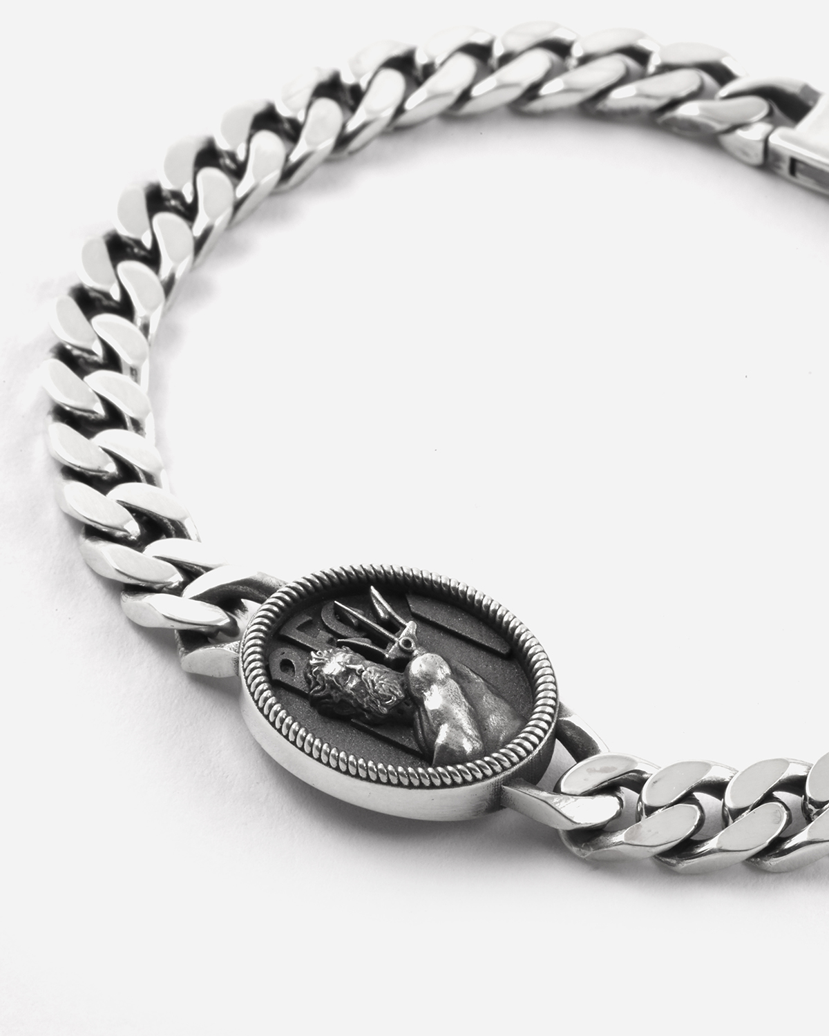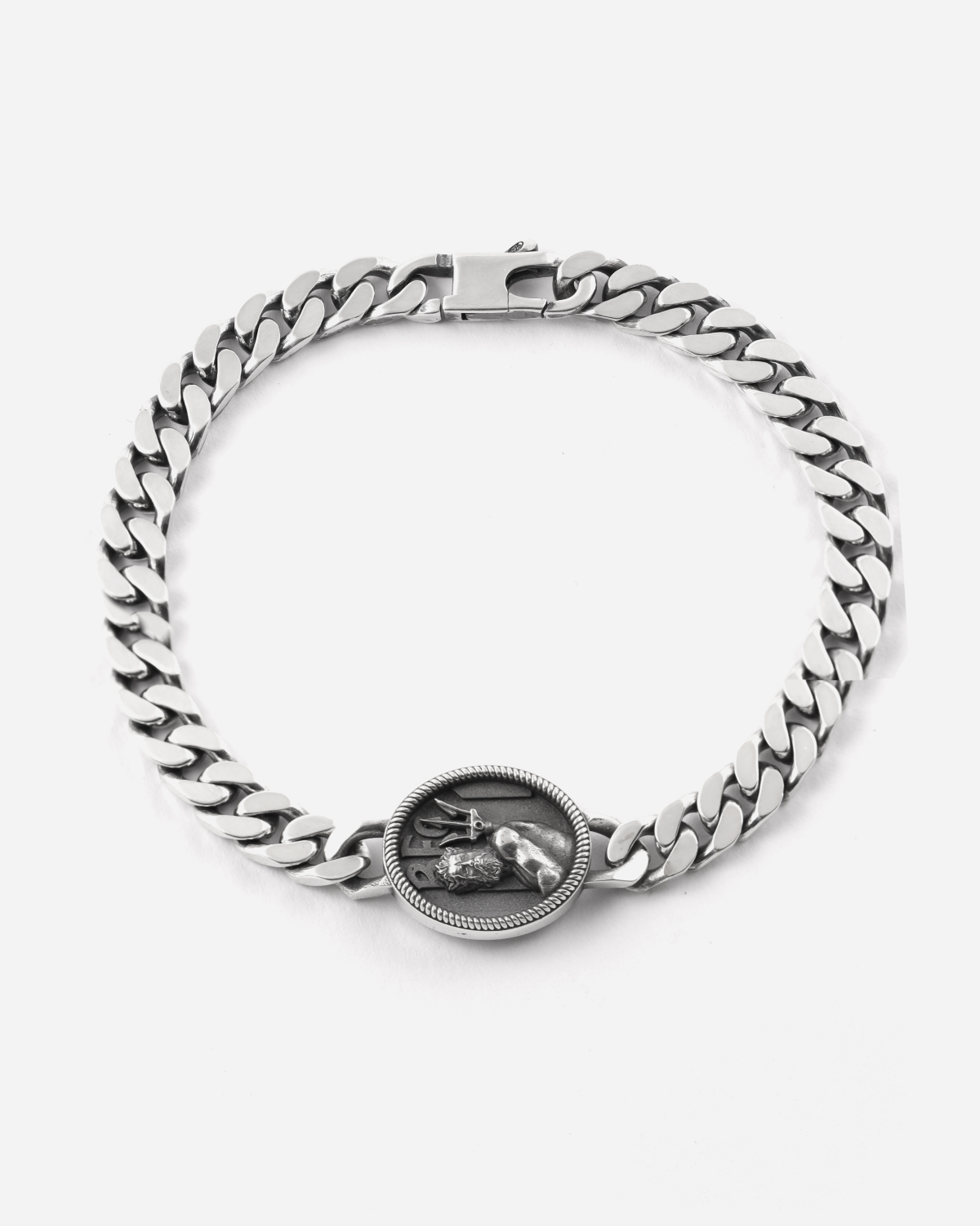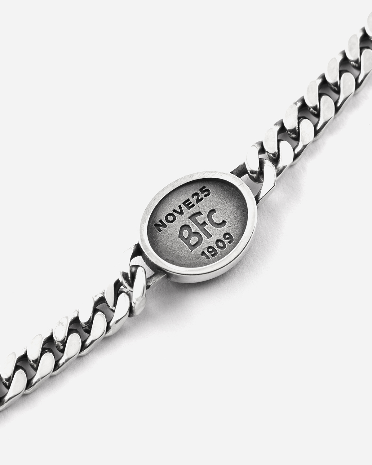 La pulsera Grumette 200 Neptuno, de plata 925, luce un óvalo con decoración de cuerda que encierra los símbolos de la ciudad y del equipo de Bolonia. El bajorrelieve del Neptuno domina el emblema del club, en una composición diseñada para celebrar la historia de la ciudad y su pasión por el deporte, en un emblema que es la única ancla del verdadero aficionado.