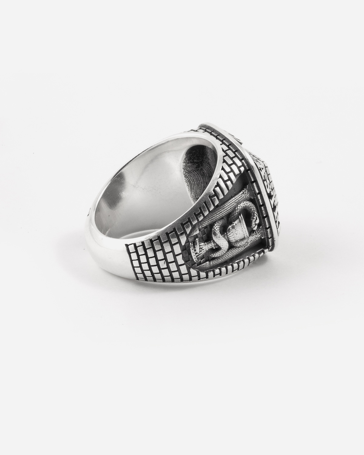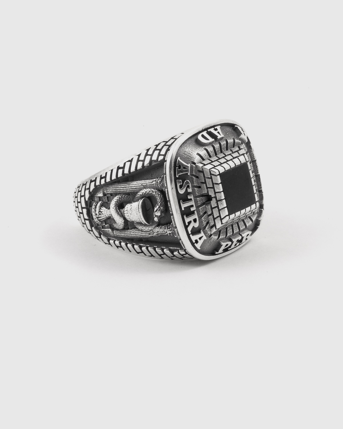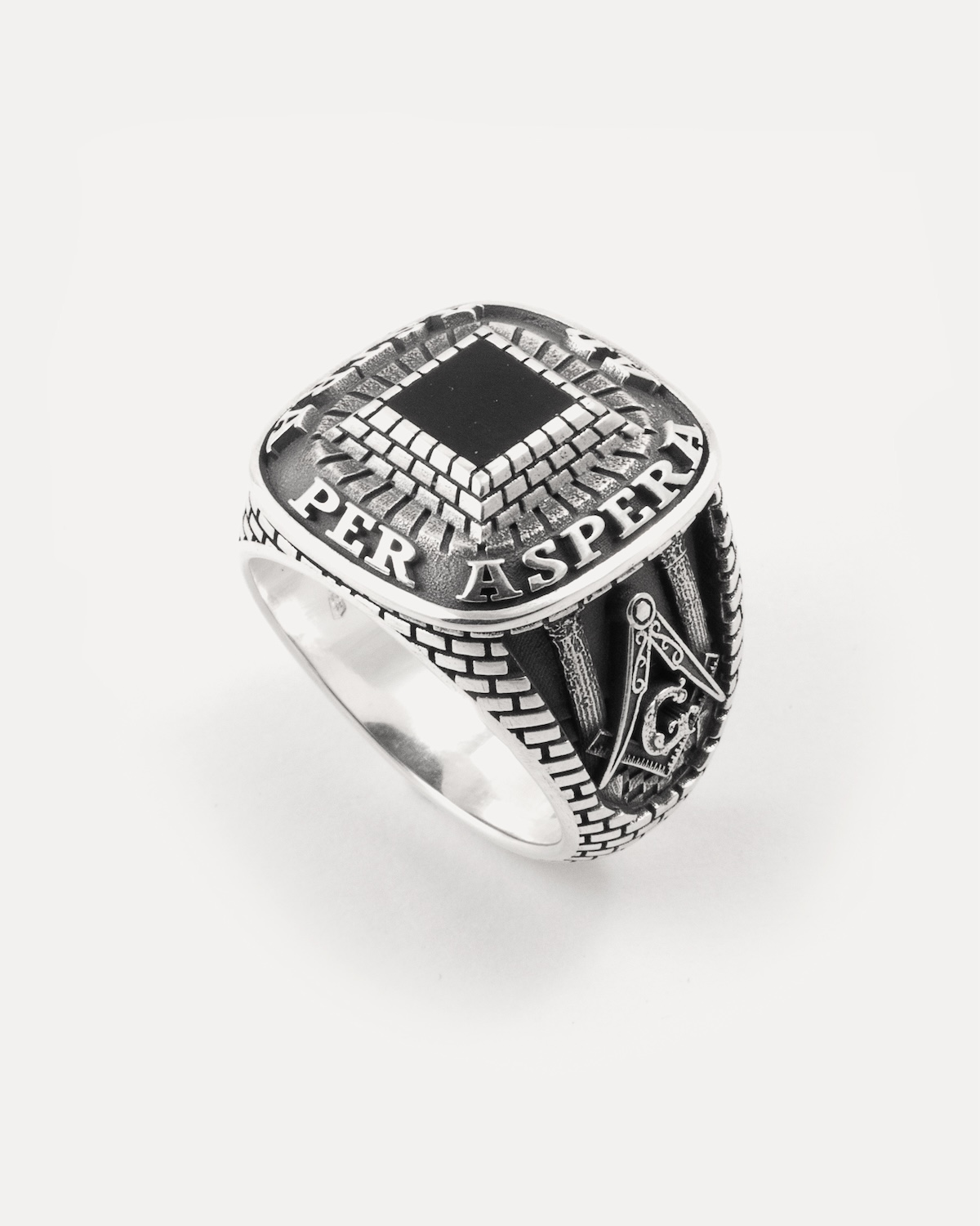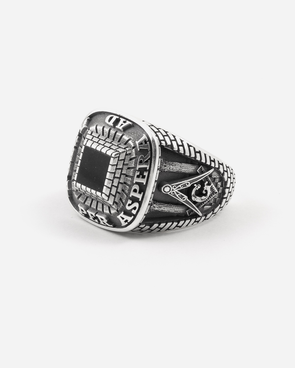 BAGUE CÉLÉBRATIF MAÇONNIQUE AD ASTRA EN ARGENT AVEC PIERRE NOIRE