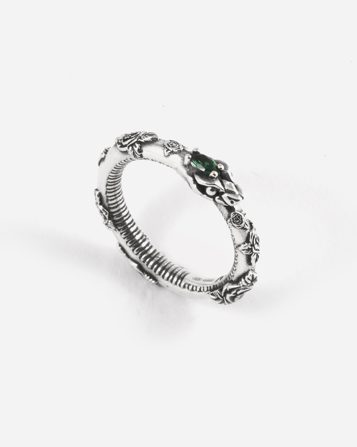 Sur la bague Ouroboros Eternal Green, le légendaire serpent qui se mord la queue est orné de roses et de zircons cubiques verts, symbolisant le cycle infini de la nature.