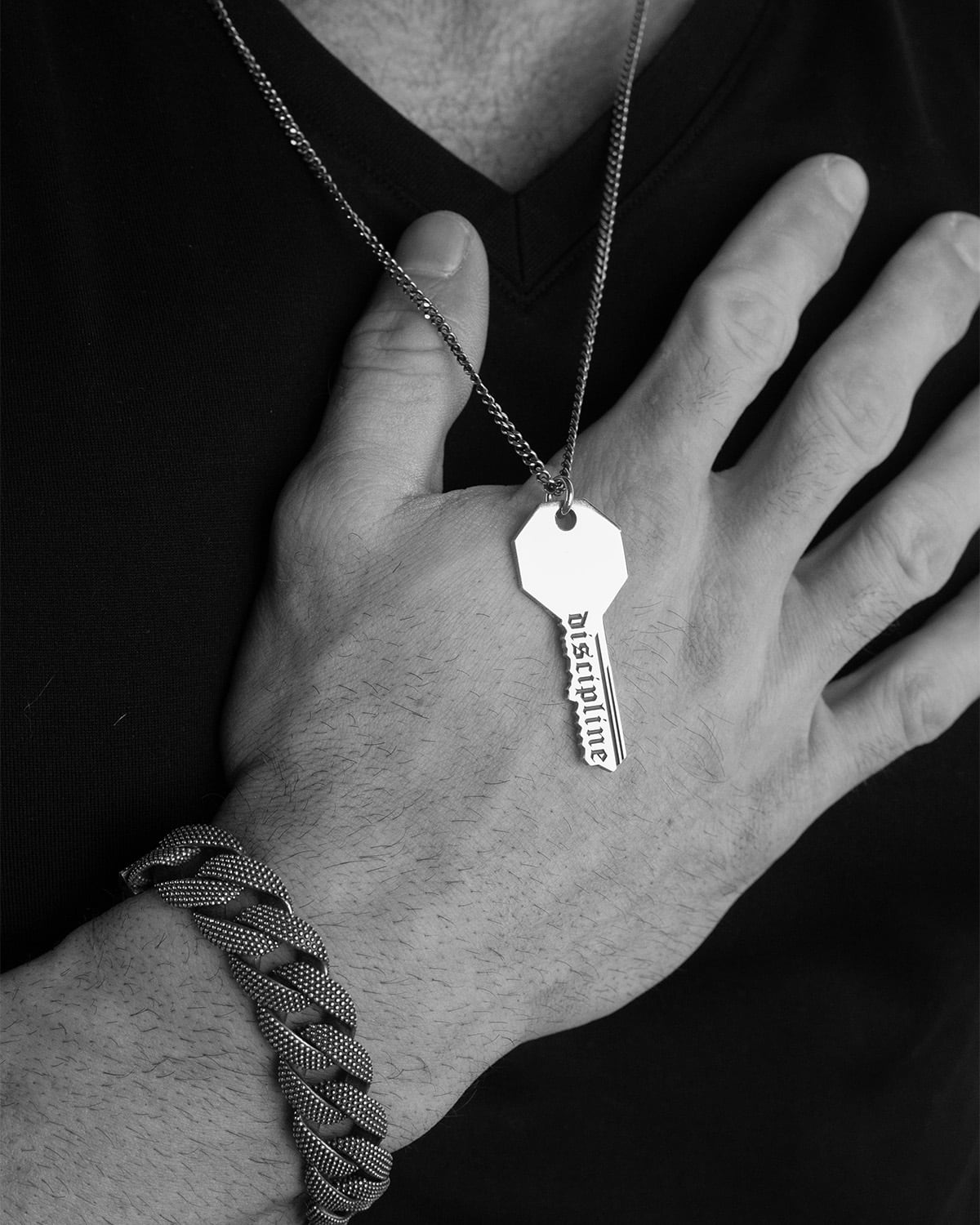 Nove25, qui récompense toujours ceux qui choisissent de ne jamais cesser de briller, a réalisé pour l'athlète le collier pendentif en argent en forme de clé, sur lequel est gravé le mot DISCIPLINE qui est ensuite devenu le nom du bijou. Discipline is the Key.