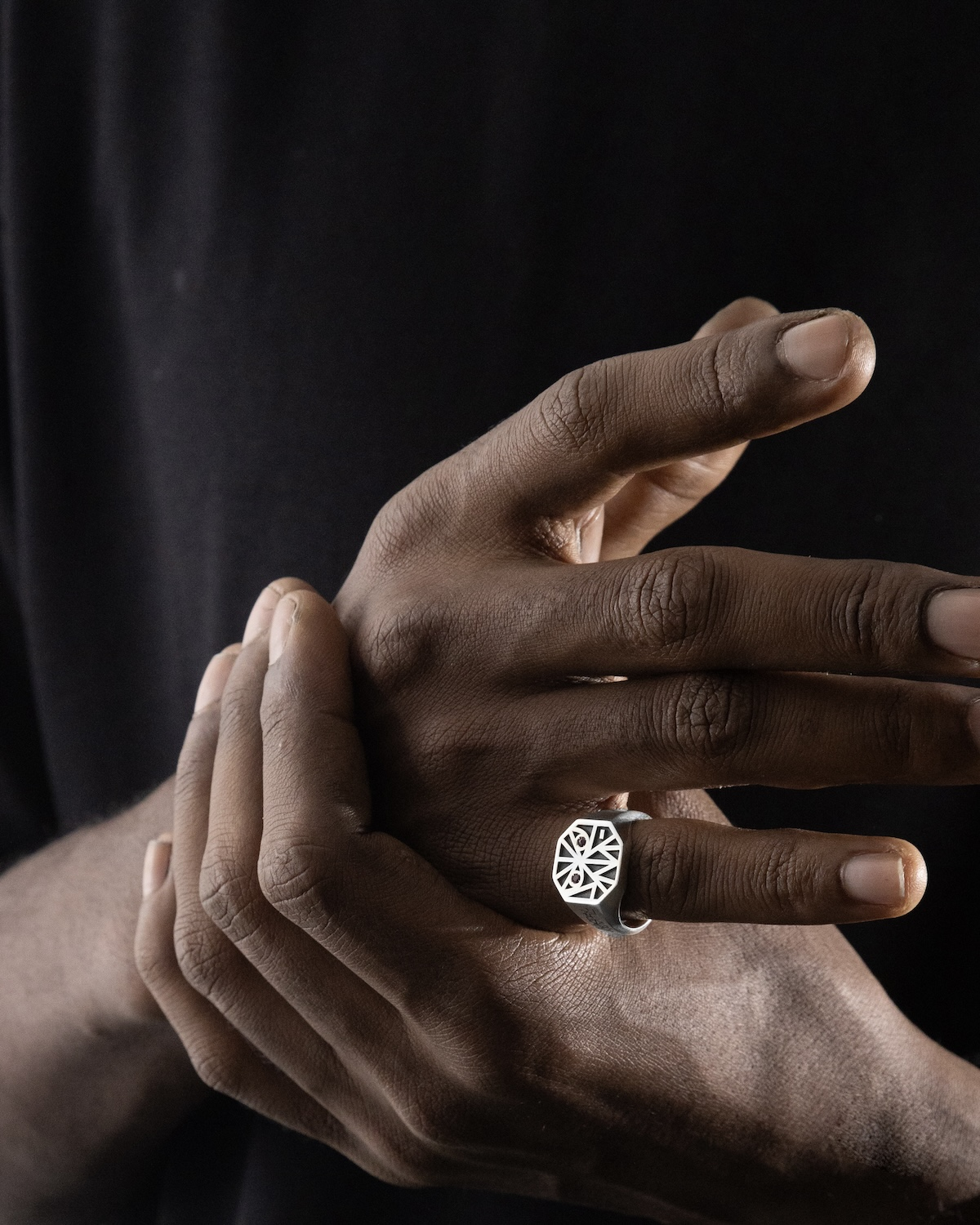 Les yeux, élément distinctif de l'œuvre de Solomostry, sont au cœur de ce chevalier octogonal, autre forme classique de Nove25. Entrelacées, les lignes en bas-relief sur une base en argent bruni décrivent des formes et des géométries rappelant un visage, dans lequel on peut reconnaître le regard qui a donné son nom au bijou. Pour personnaliser et rendre la bague Eyes encore plus unique et intime, il est également possible de l'agrémenter de deux pierres de couleur, qui deviennent deux pupilles capables d'évoquer des souvenirs et d'illuminer l'avenir.