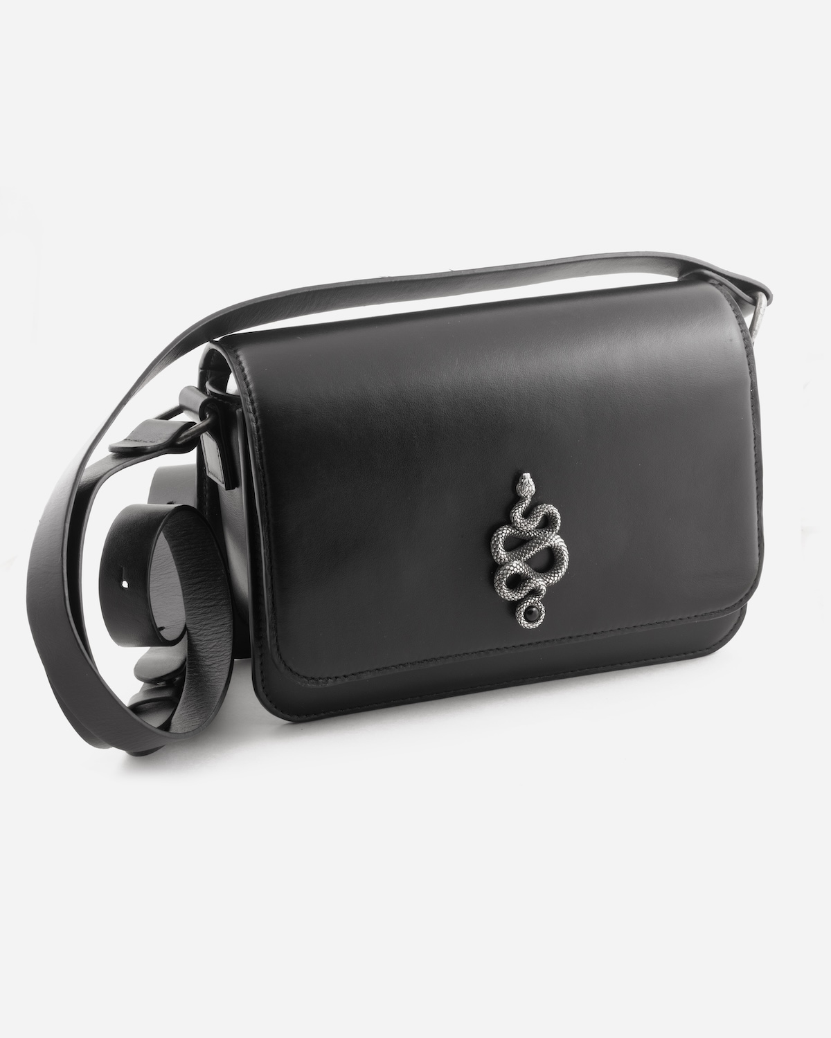 Réalisé en cuir de vachette véritable, le sac est rehaussé d'un insert représentatif en forme de serpent en argent massif 925 avec un détail en agate noire brillante, élément symbolique qui souligne son caractère fort et sophistiqué.