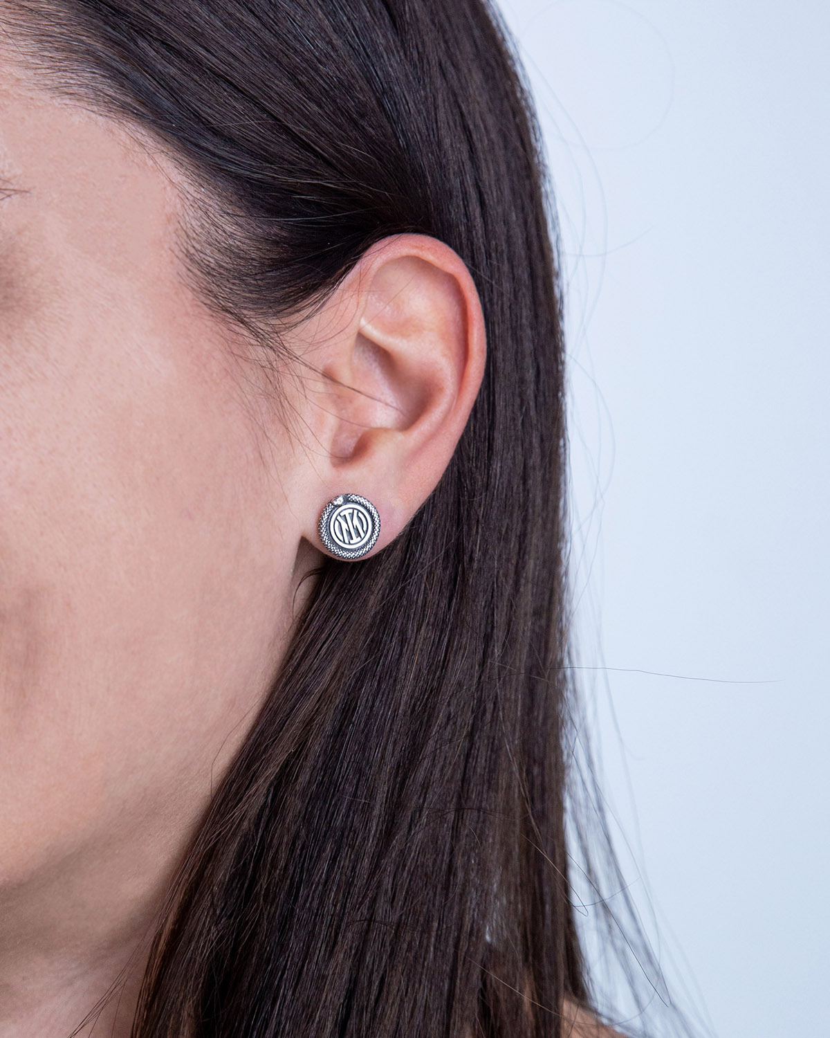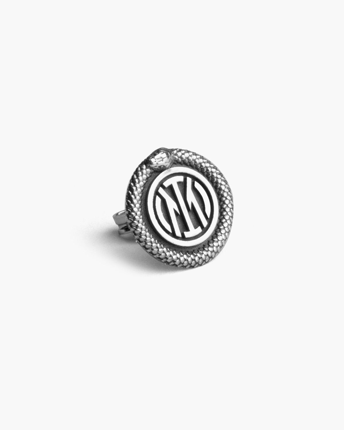 Single silver earring with a circular snake and the Inter logo. Diameter: 1.2 cm.
