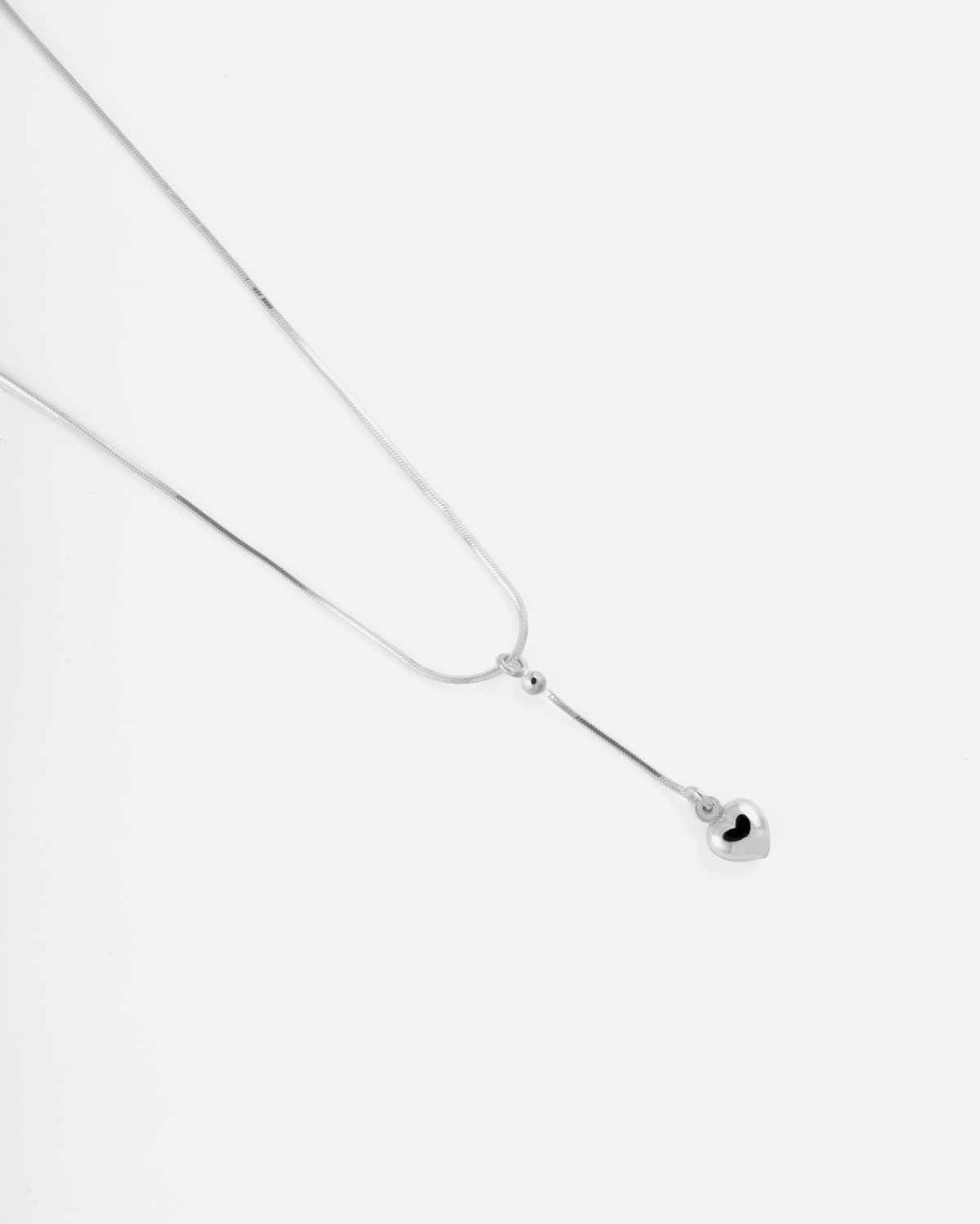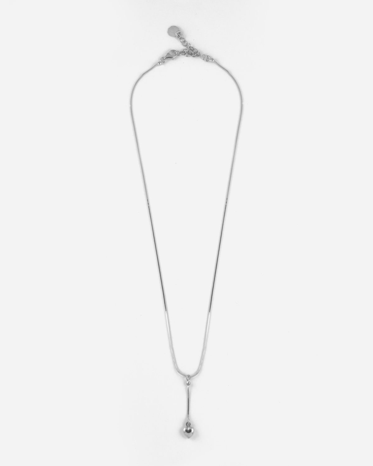 The Silver Heartie Bow Tie Necklace, in its silver version, features a slender pendant ending in a small heart.