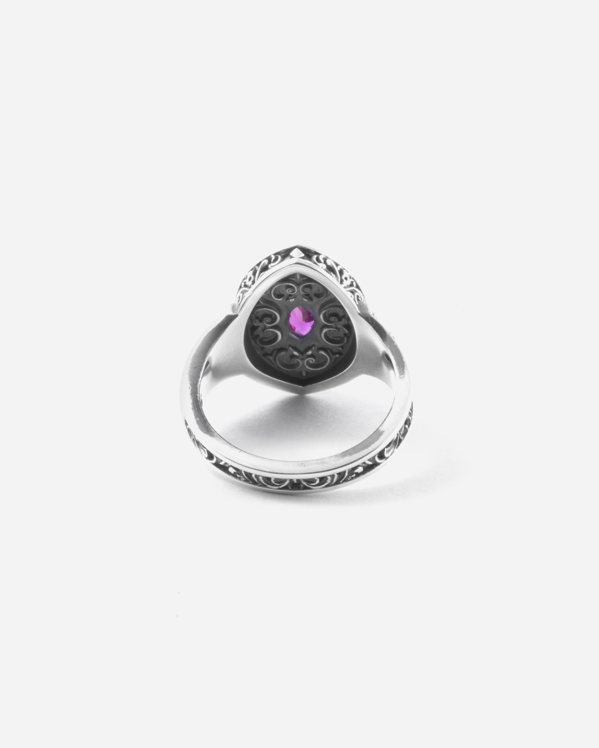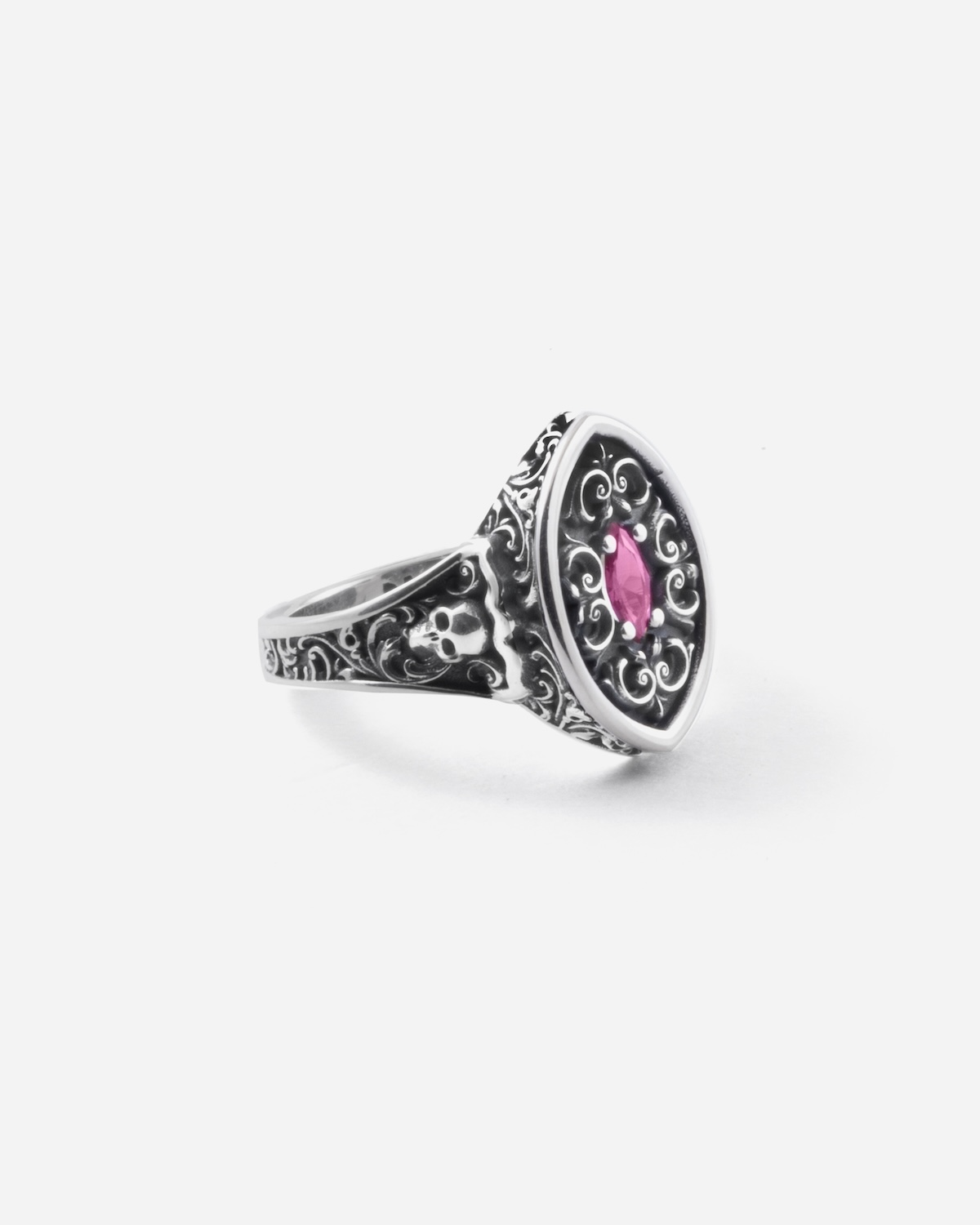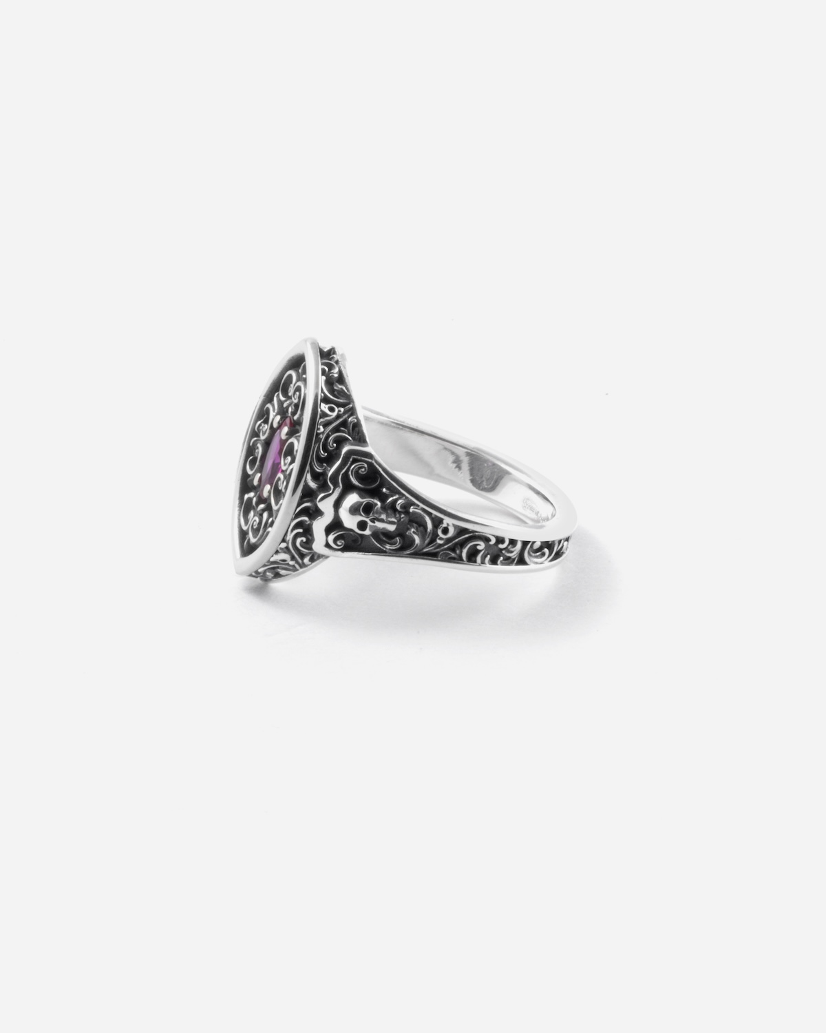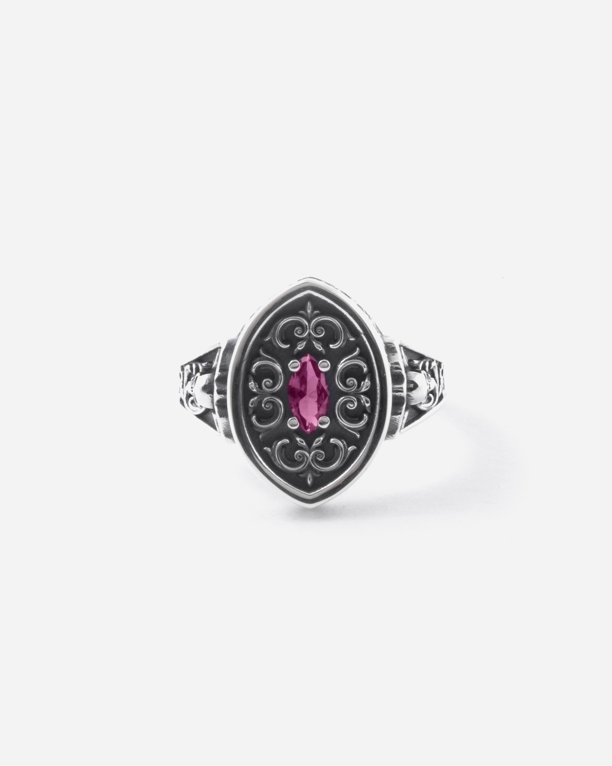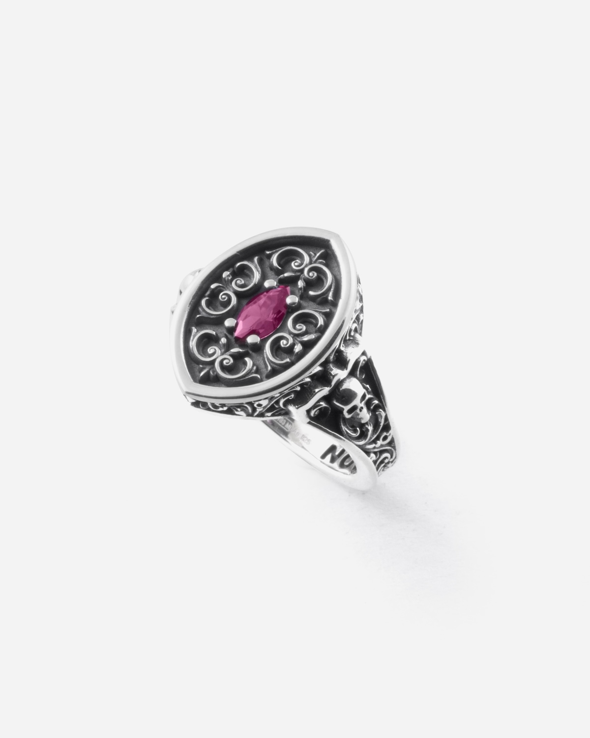 The Bonnie Decorated Marquise Signet Ring With Red Stone is part of the Eden Collection and is made in 925 Sterling Silver. Every Nove25 jewel is designed and produced in Italy using the most modern technologies then hand finished to ensure maximum detail and the highest quality. This jewel finish is Polished Burnished and it is available in the following sizes: 10-12-14-16-18-20.