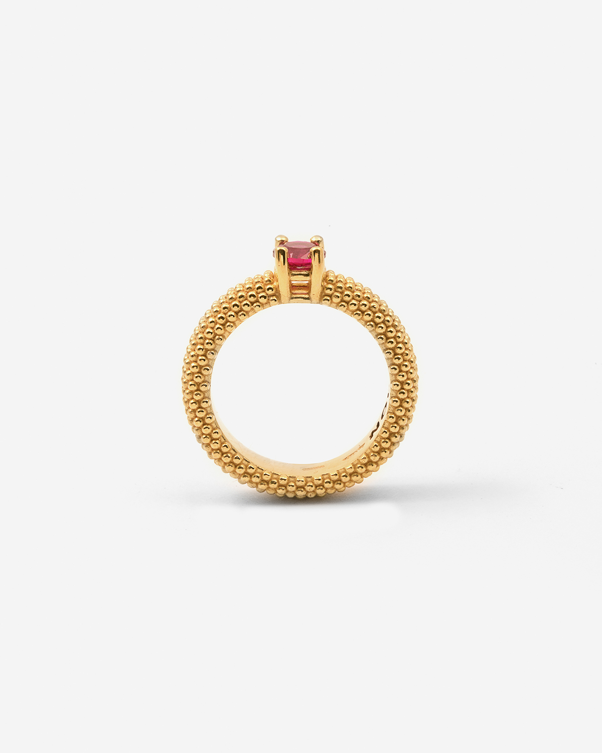 The red corundum solitaire, like a keystone, complements the dotted gold band and connects the two warmest and cosiest primary colours.