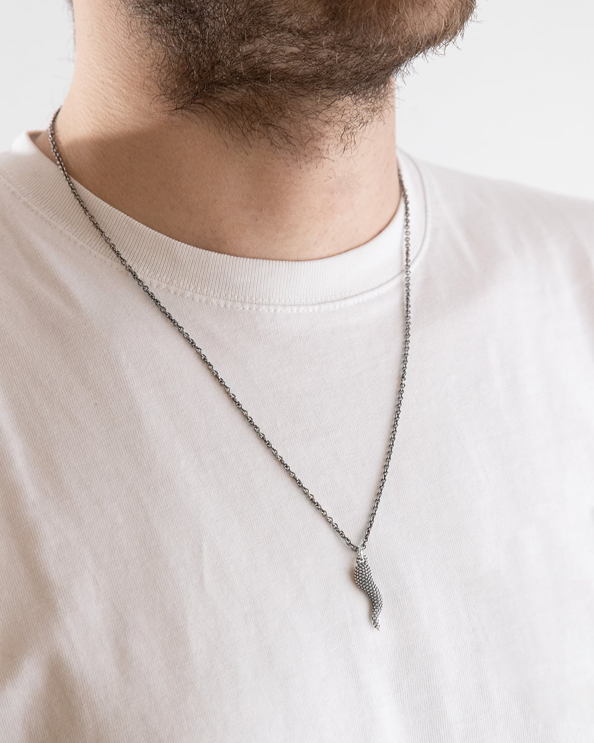 Il Pendente Cornino Puntinato Medio fa parte della Collezione Puntinati ed è realizzato in Argento 925. Come tutti i gioielli Nove25 anche questo Pendente viene progettato e lavorato in Italia mediante l'utilizzo delle più moderne tecnologie e rifinito a mano per garantirne il massimo dettaglio e la più elevata qualita'. Questo gioiello viene proposto con una finitura Brunito Lucido ed è disponibile in taglia unica.