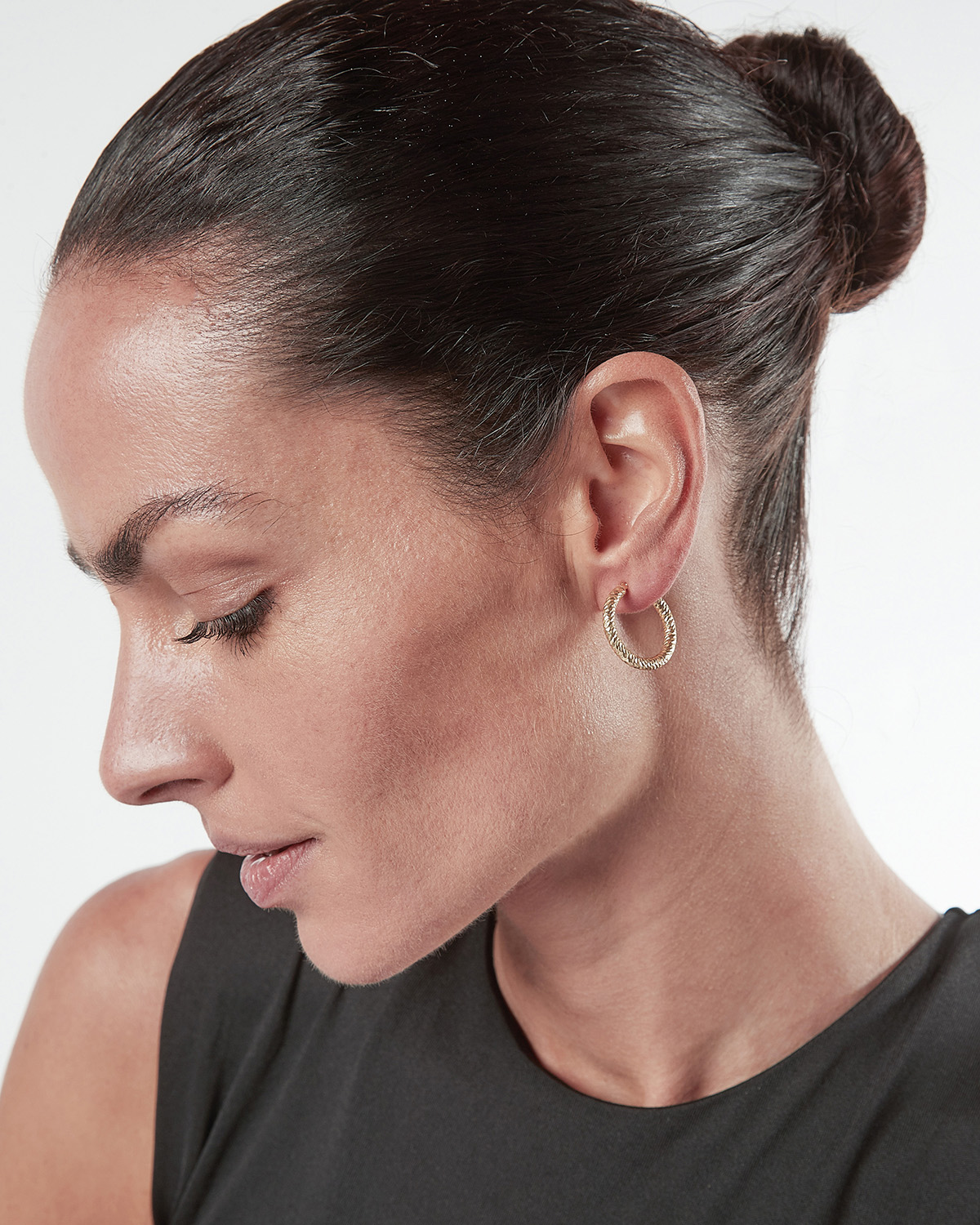 Con gli orecchini singoli Diamond Hoop, piccoli e grandi, in oro giallo o rodio lucido, Nove25 sceglie di nuovo la brillantezza. La classica forma a cerchio è disponibile adesso nella alternativa che illumina il viso di chi gioca col tempo senza rinunciare all’originalità.