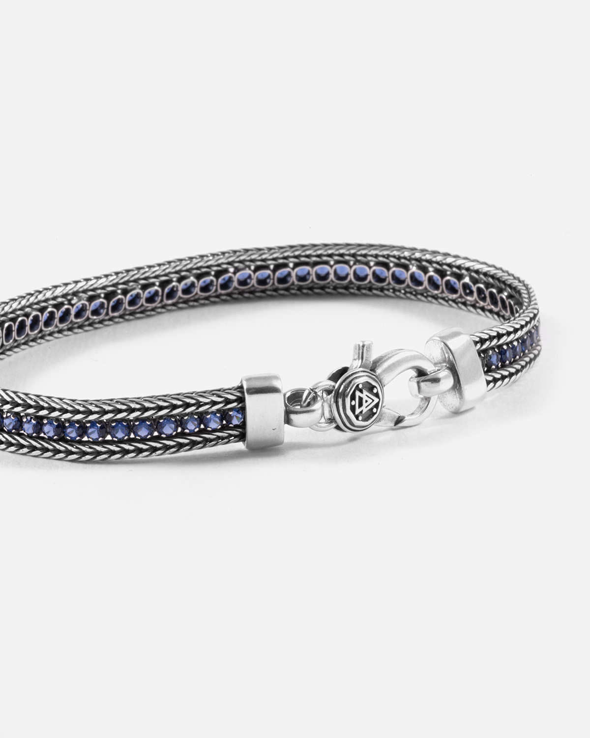 Two silver foxtail rope-chain contours overhaul this classic tennis bracelet adorned with blue zirconia. With this FOXTAIL TENNIS bracelet, tradition takes on a modern guise and flaunts the Nove25 logo on the clasp.