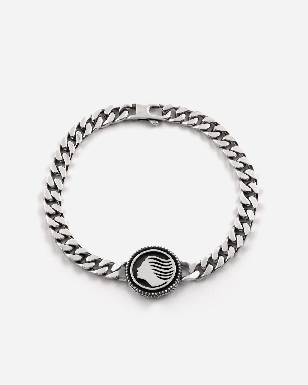 Brilliant and impactful, the Curb Chain Logo Bracelet, with silver metering and lobster clasp, embraces the Dea's bas-relief symbol, surrounded by a double circle of dotted pattern. On the back of the emblem, Nove25 and Atalanta reconfirm their partnership, synthesizing it into a perfect piece of jewelry for those who cheer from the stands and in everyday life.