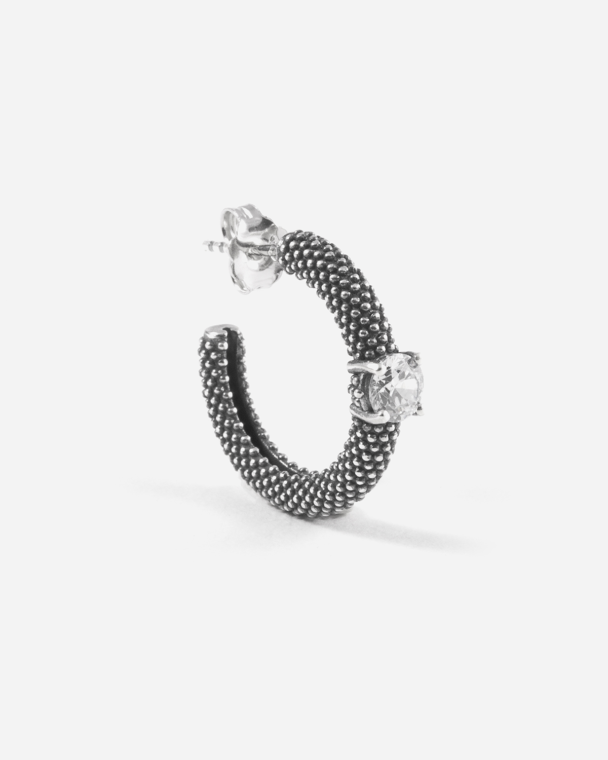 The Solitaire Dotted Hoop Earring With White Brilliant is part of the Puntinati Collection and is made in 925 Sterling Silver. Every Nove25 jewel is designed and produced in Italy using the most modern technologies then hand finished to ensure maximum detail and the highest quality. This jewel finish is Polished Burnished and it is available in one single size.
