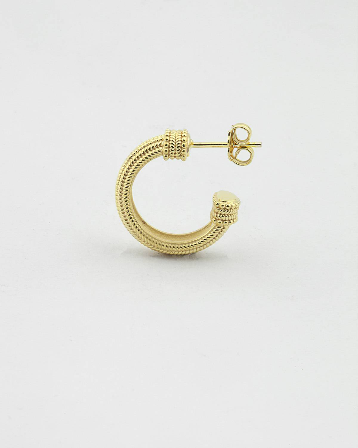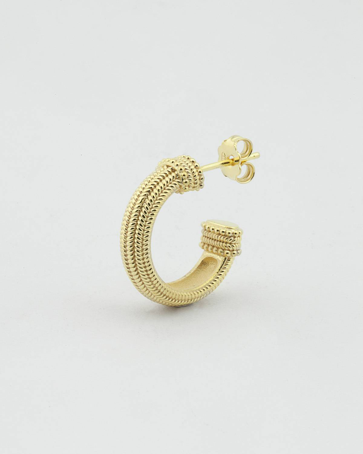 The Magna Grecia Round Circle Hoop Single Earring is part of the Antique Collection and is made in 925 Sterling Silver. Every Nove25 jewel is designed and produced in Italy using the most modern technologies then hand finished to ensure maximum detail and the highest quality. This jewel finish is Yellow Gold and it is available in the following sizes: O/S