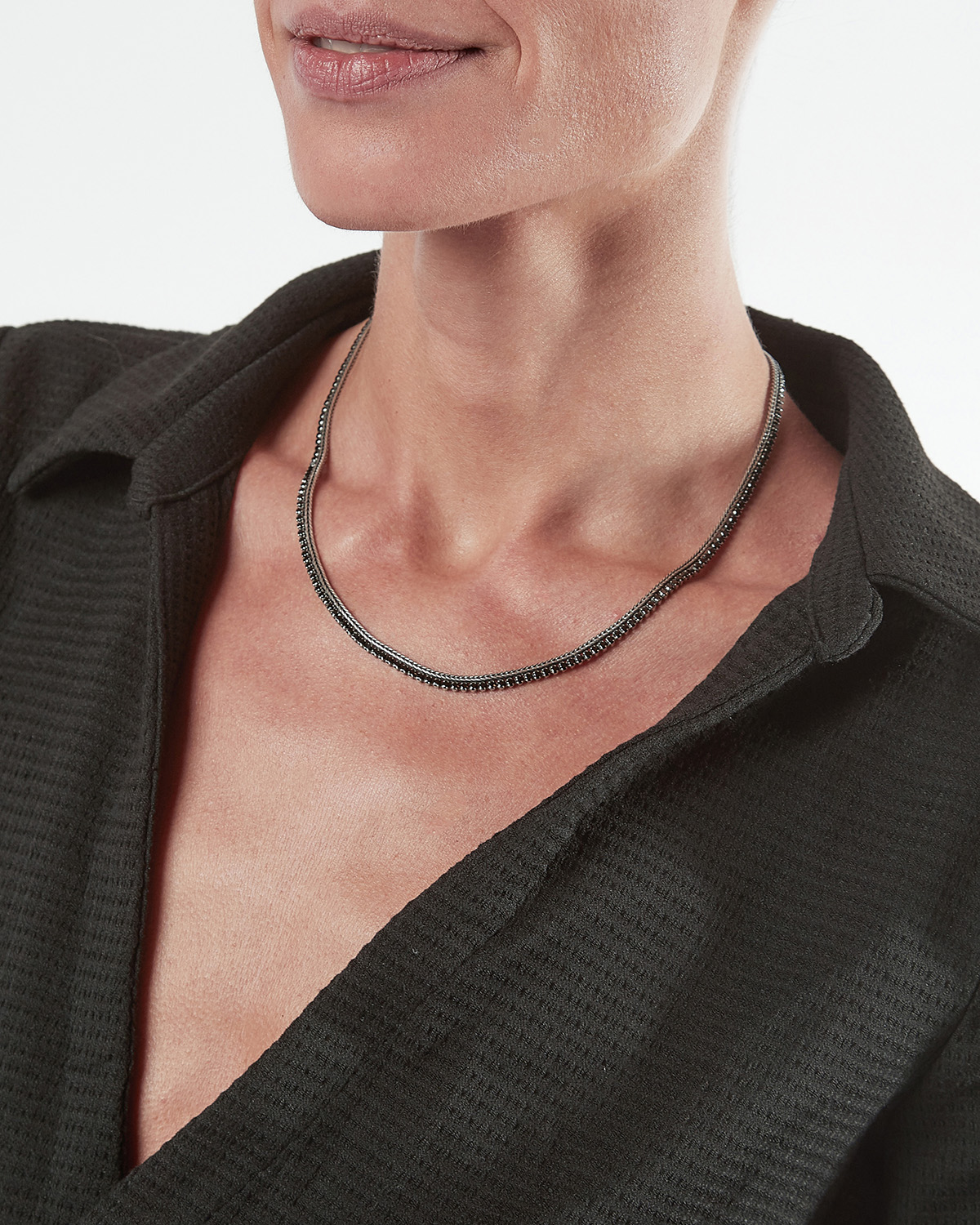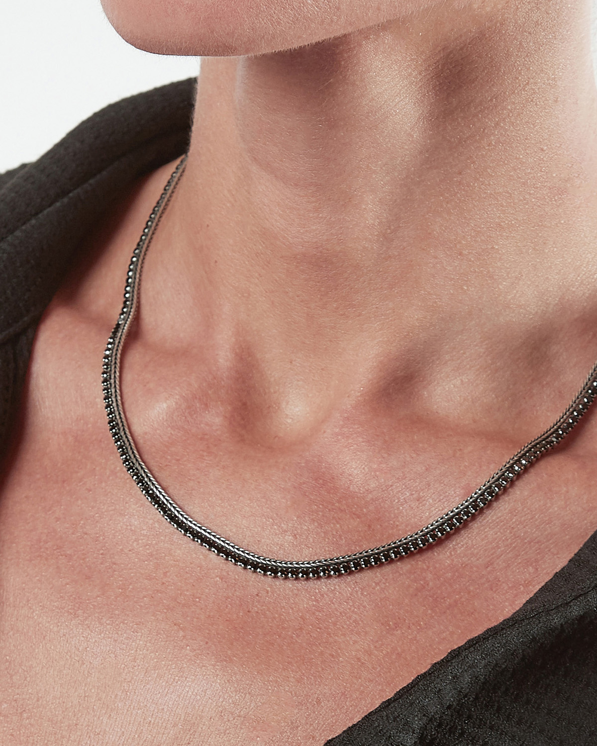 The Black Foxtail Tennis Necklace is part of the Timeless Collection and is made in 925 Sterling Silver. Every Nove25 jewel is designed and produced in Italy using the most modern technologies then hand finished to ensure maximum detail and the highest quality. This jewel finish is Polished Burnished Silver and it is available in the following sizes: 45 cm.