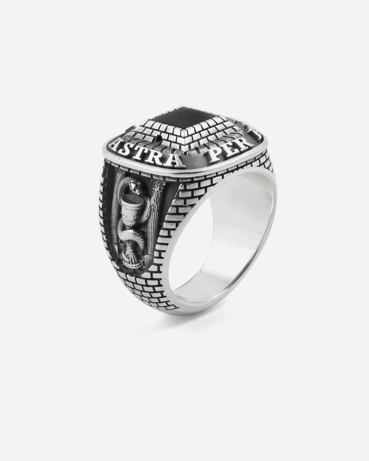 Re-edition of a 2013 model that appeared on the cover of Fedez's album “Brainwash,” the Ad Astra ring, with Masonic-referenced decorations, is topped by a pyramid section with a flat onyx stone and the motto “Per aspera ad astra.” On the sides, compass, G and brick texture details complete the mystical design of the jewel, an amulet heralding better times.